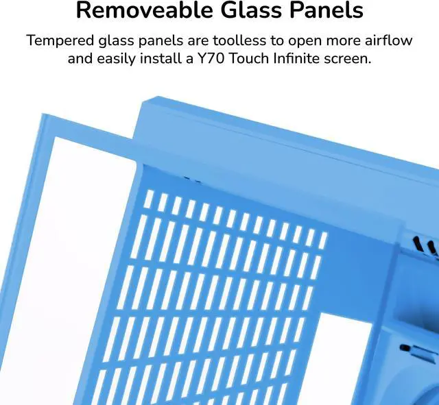 Unified Modern AestheticWith 4 unique colorways, Y70 puts your build front and center with a beautifully crafted 3-piece panoramic glass which serves as a window into the heart of your PC. The dual chamber interior layout keeps the front looking great while giving you plenty of space to manage cables in the back, especially with the help of our seamless L-shaped molded rubber grommet, meticulously placed cable routing channels & tie-down points, and reusable Self-Securing Closure straps. All easily accessible with tool-less top and side panels alongside floating storage sleds that eject from the rear of the case for intuitive drive maintenance.