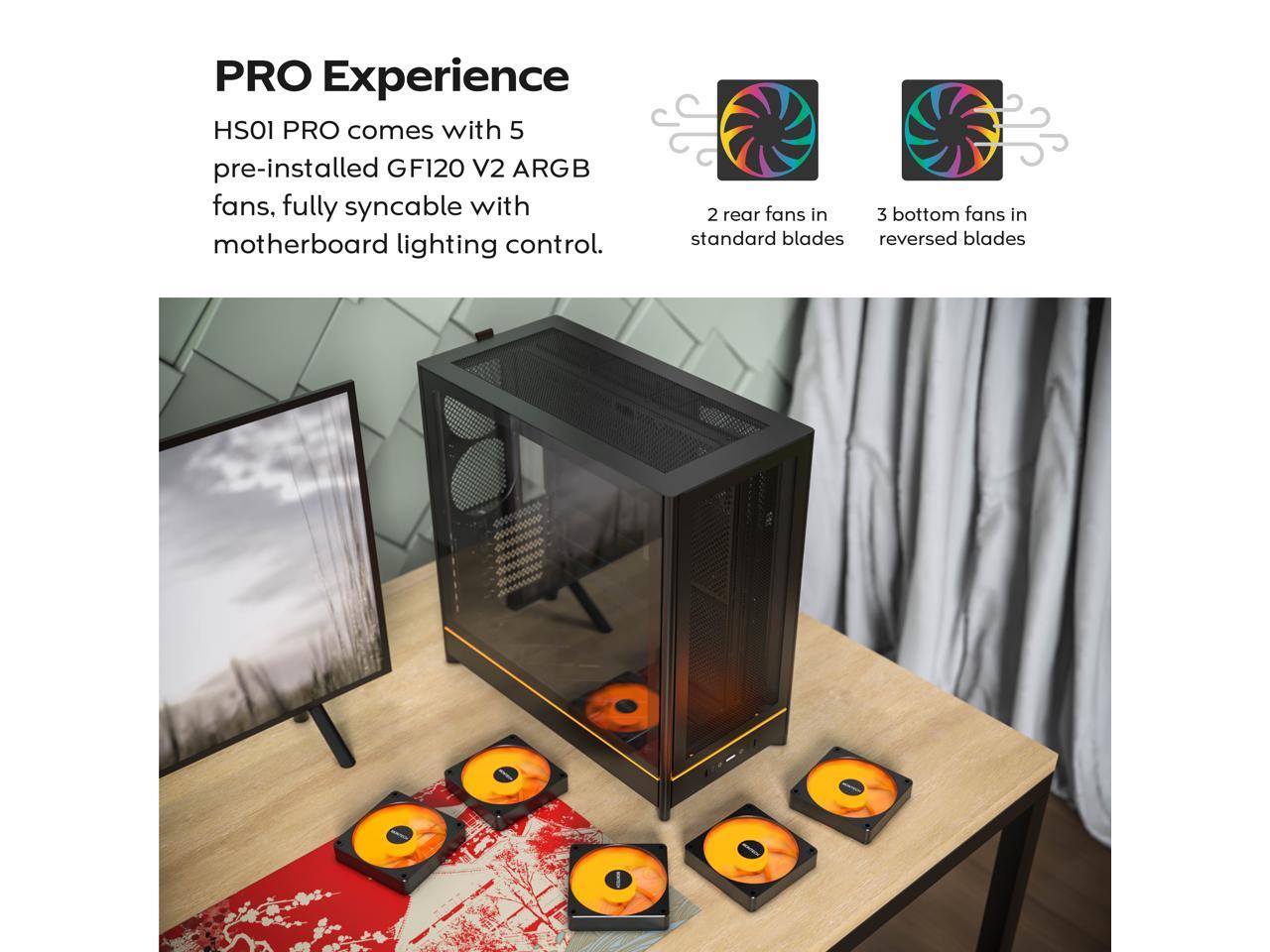 MONTECH HS01 PRO, ATX Mid-Tower PC Case, Gaming PC, High-Airflow, Reversible Layout, Mesh Front Panel, 5x ARGB PWM Fan Pre-Installed, Sink-in Design, Toolless Panels, Black
