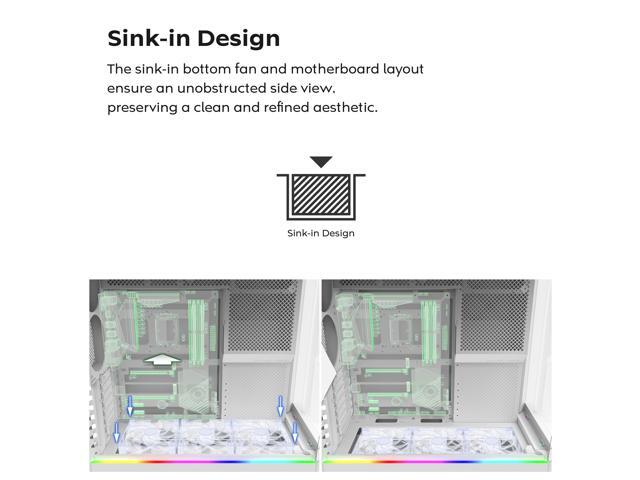 - Sink-In Design: A recessed bottom fan and motherboard layout maintain a clean, unobstructed side view.