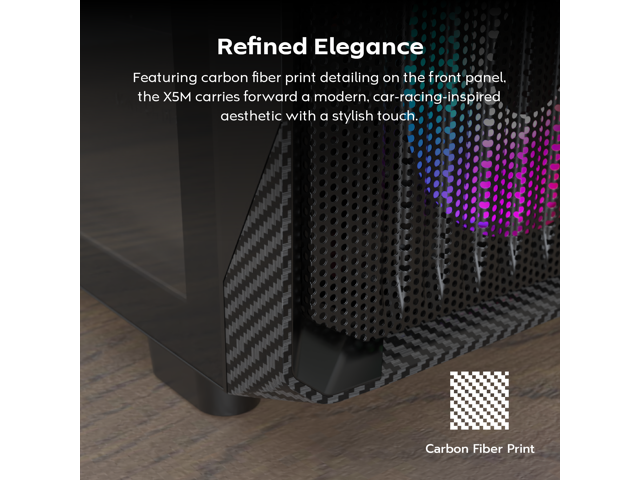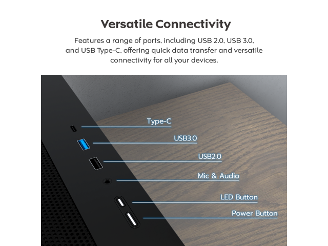 - Gaming-inspired Front Panel: A boldly styled front panel design enhances visual impact while complementing the illuminated front fans. Crafted with gamers in mind.