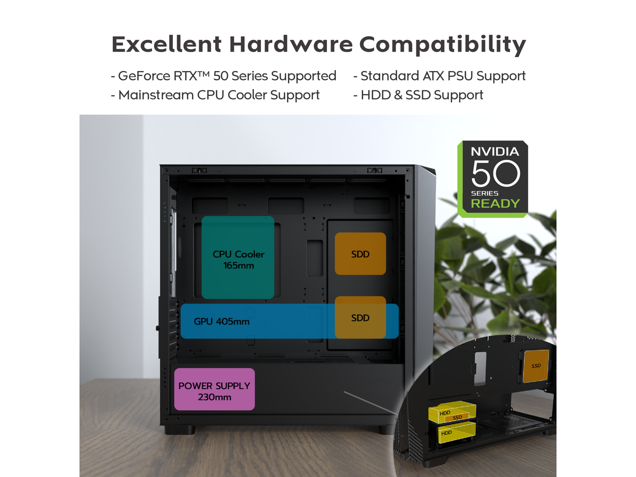 - Latest GPU Support: With an enlarged internal capacity, the case supports GPUs up to 405mm in length. Ready for the latest RTX™ 50 Series and other high-performance graphics cards.