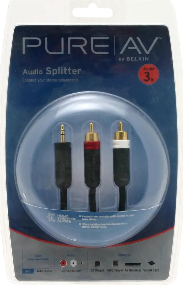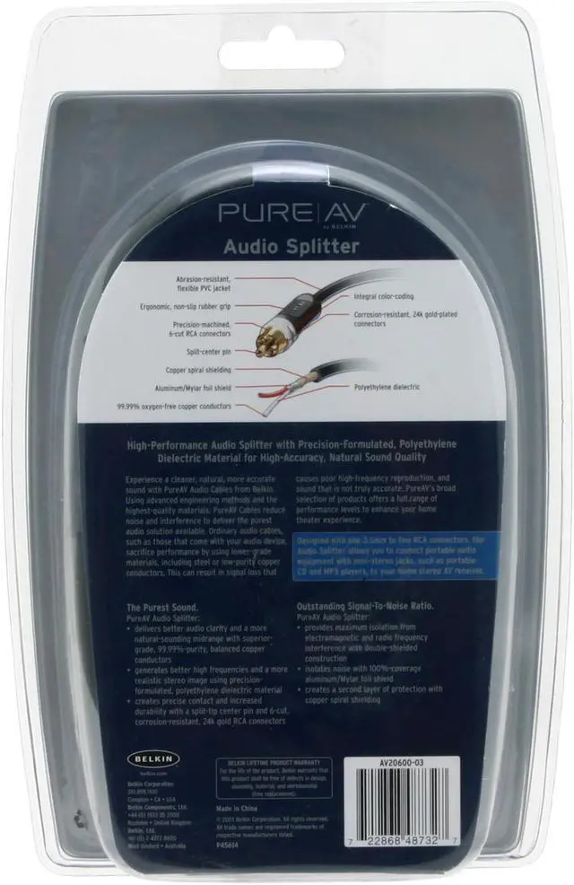 | Features | Designed with one 3.5mm to two RCA connectors, PureAV Blue Series Audio Splitters allow you to connect portable audio equipment, such as portable DVD players, CD, MP3 and other digital audio players, to your AV receiver. Designed with high-quality materials, Blue Series Audio Splitters isolate your signal from interference to deliver cleaner, more accurate sound from your components. |