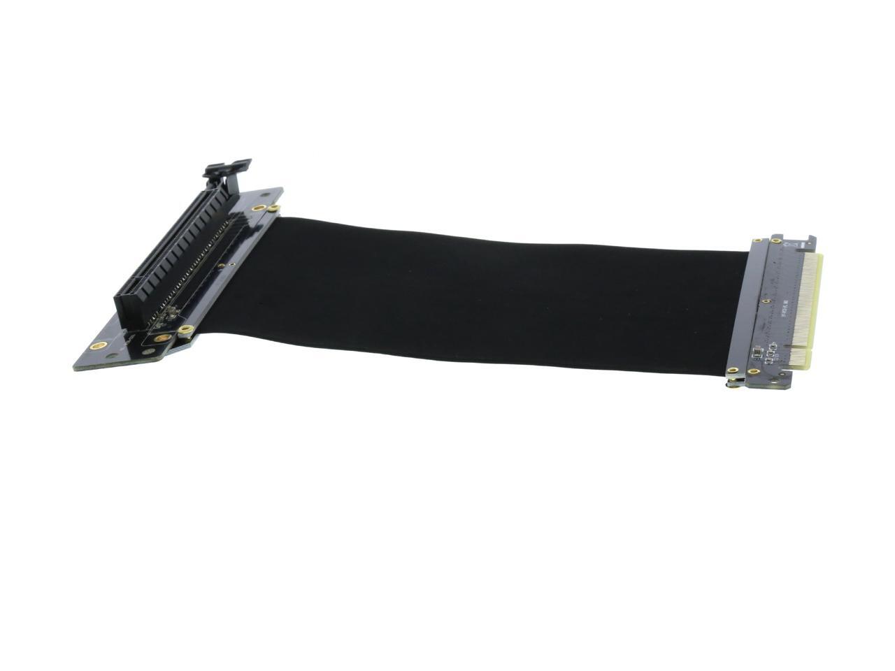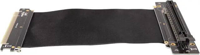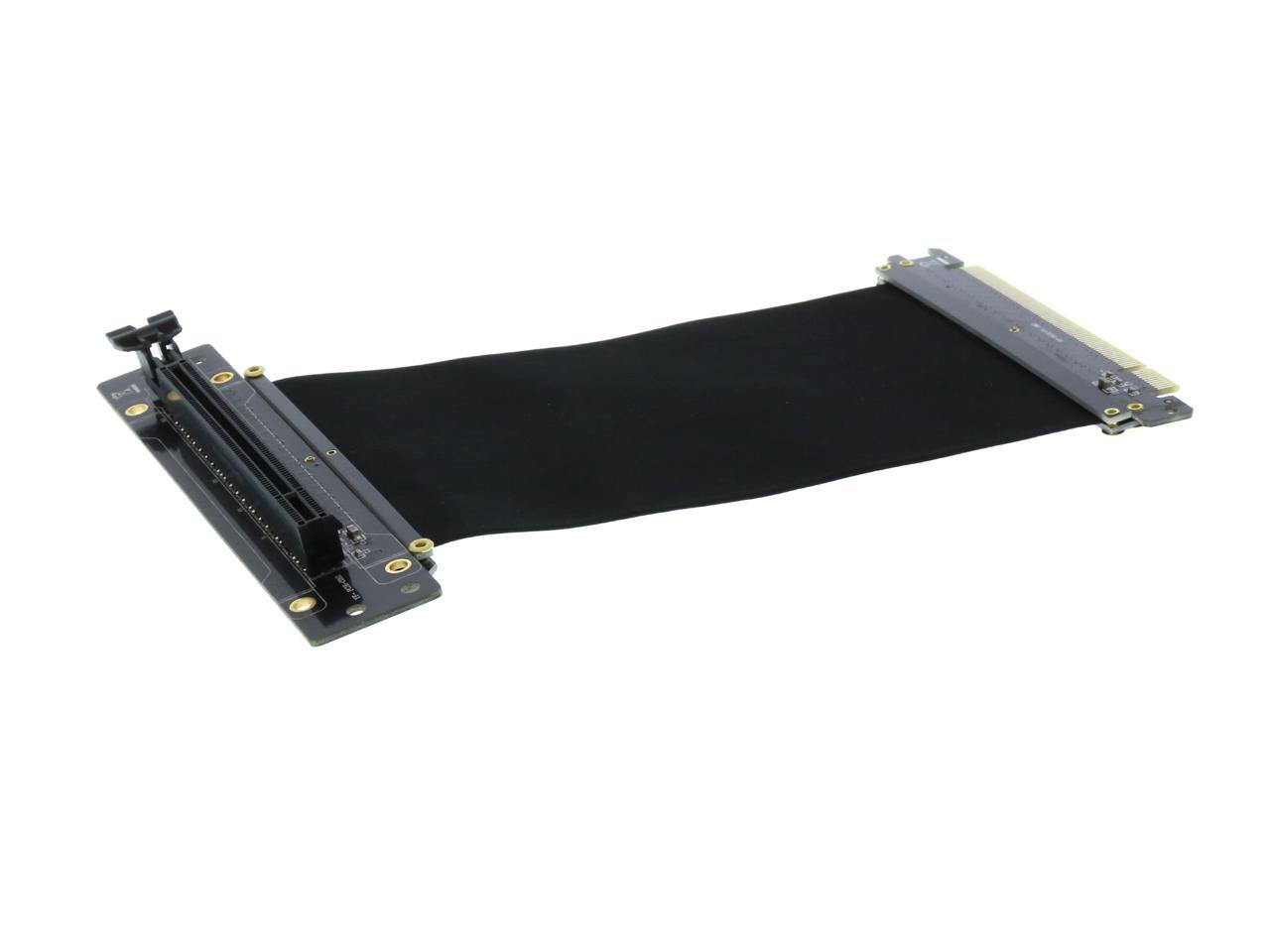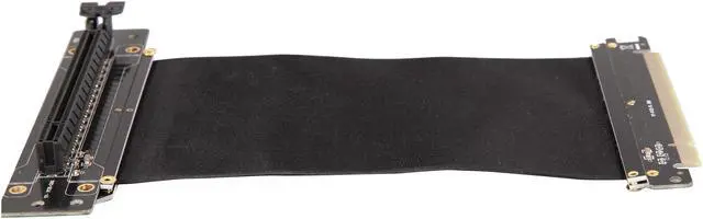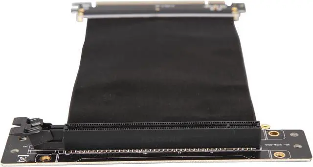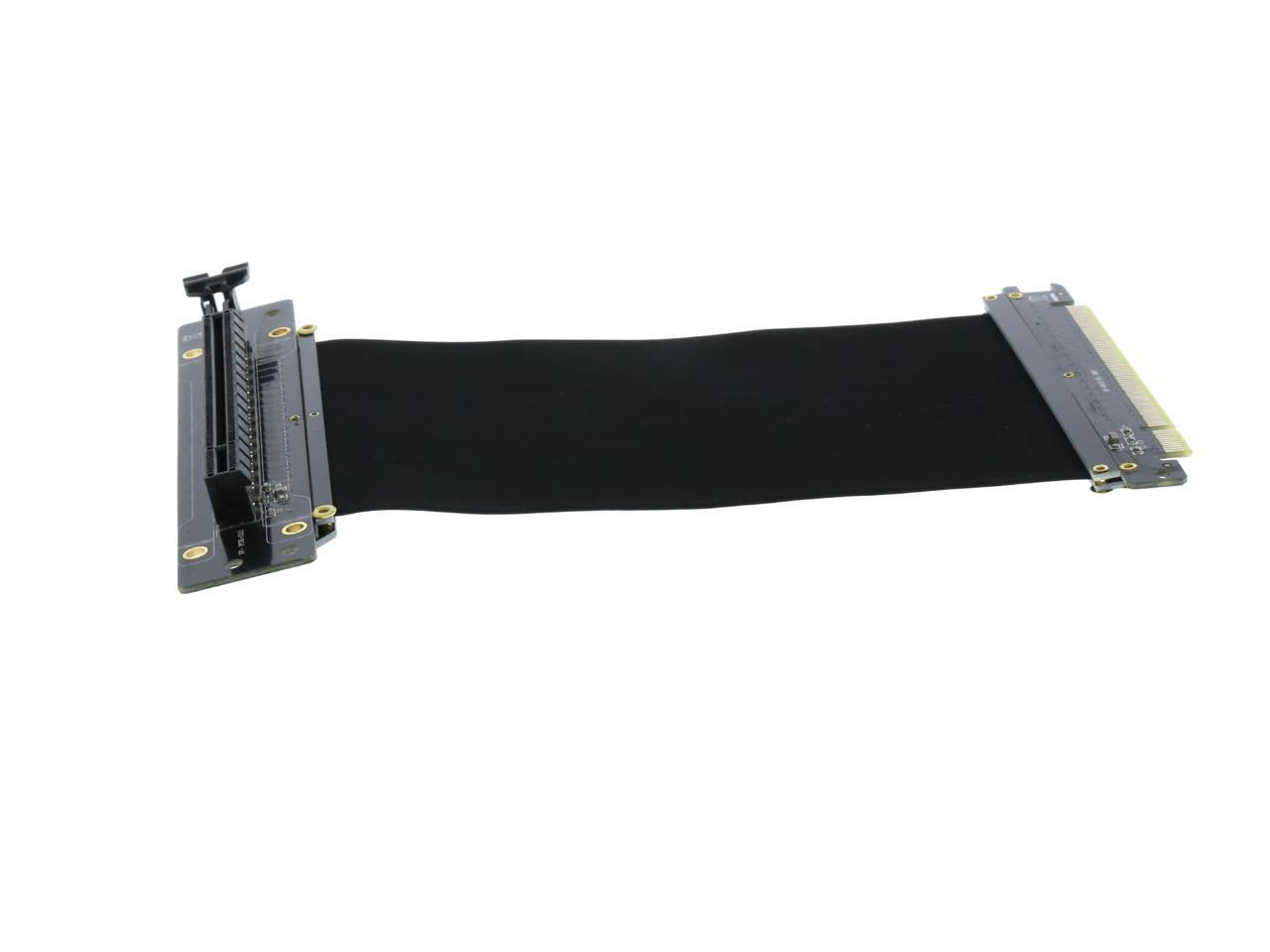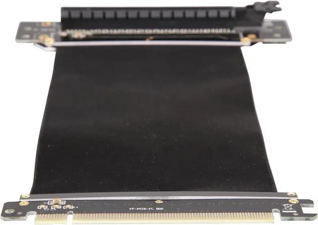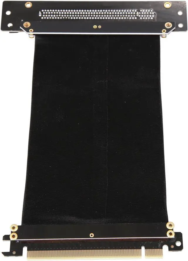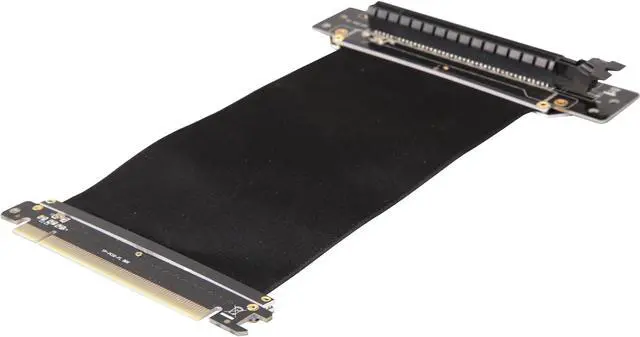 A PCI-E x16 male connector at one end is for connecting to your motherboard, and a PCI-E x16 female 90-degree right angle connector at the other end is for connecting to your graphics card.