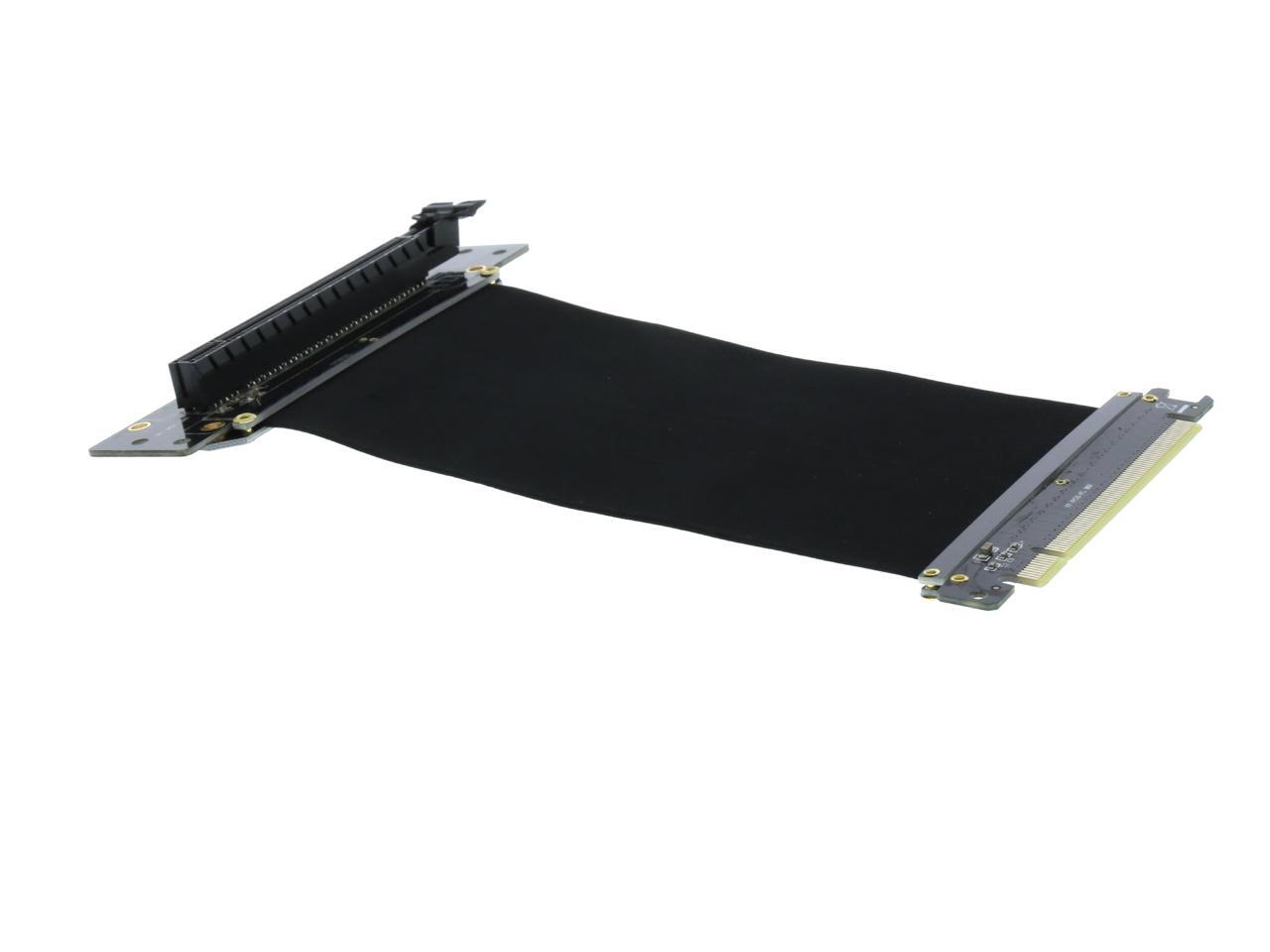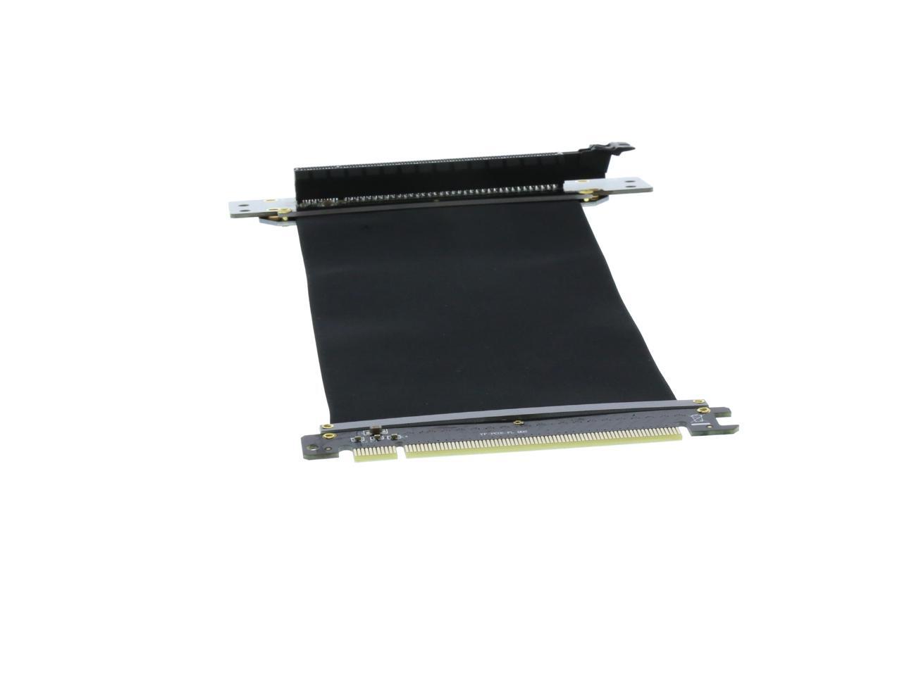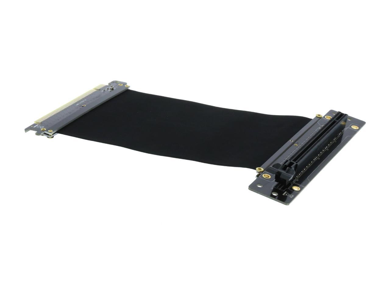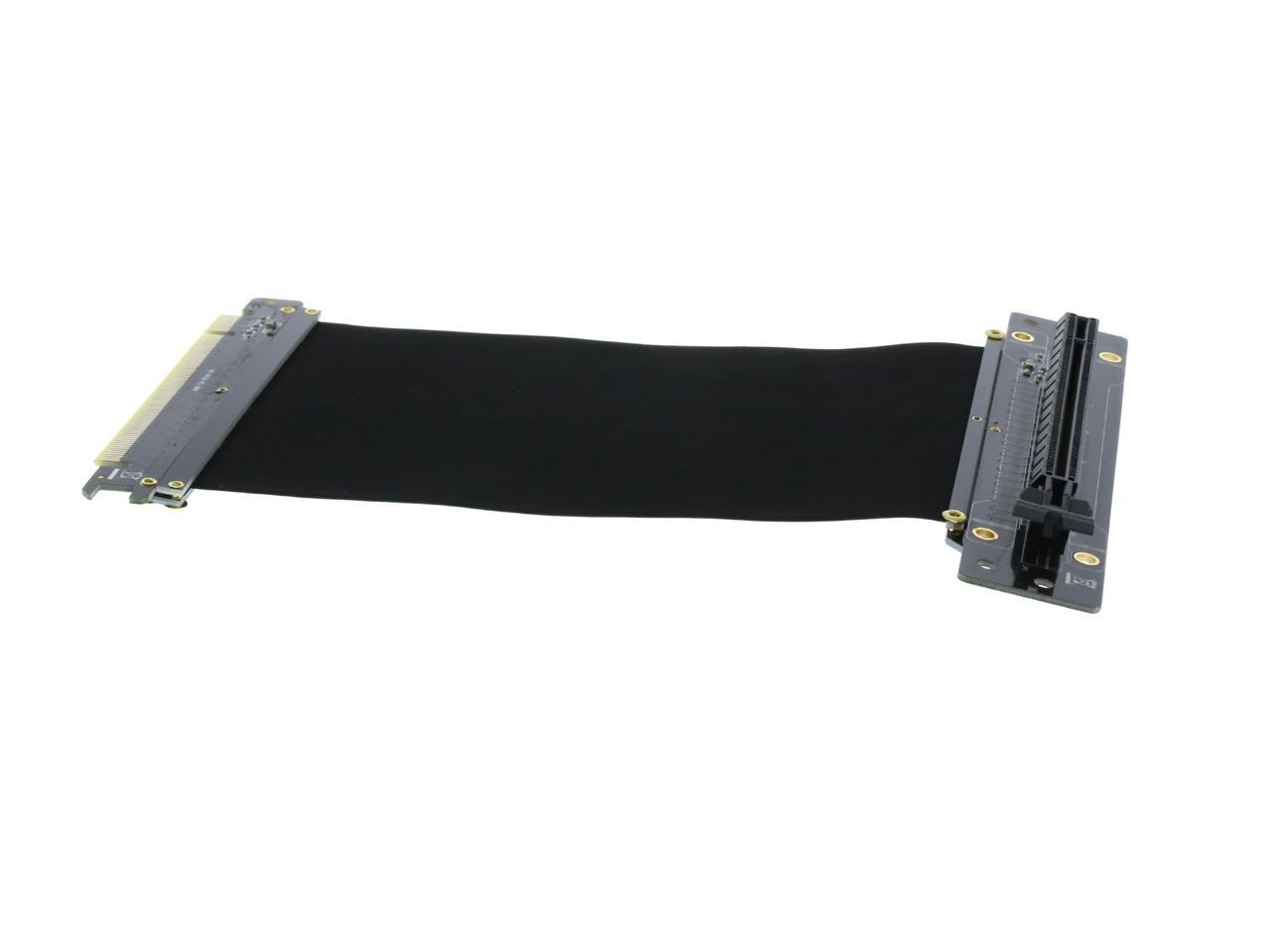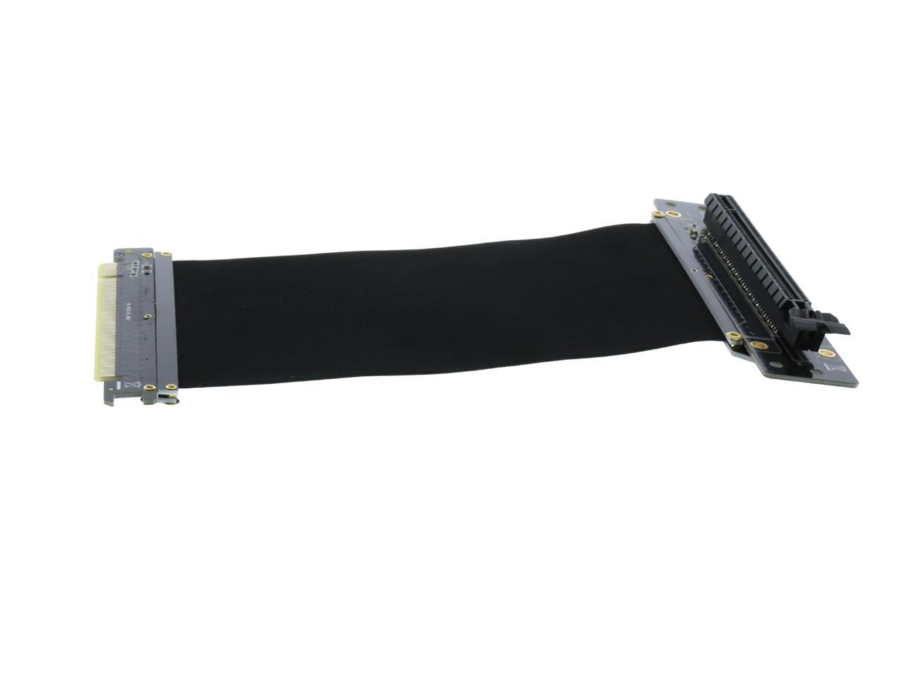 A PCI-E x16 male connector at one end is for connecting to your motherboard, and a PCI-E x16 female 90-degree right angle connector at the other end is for connecting to your graphics card.