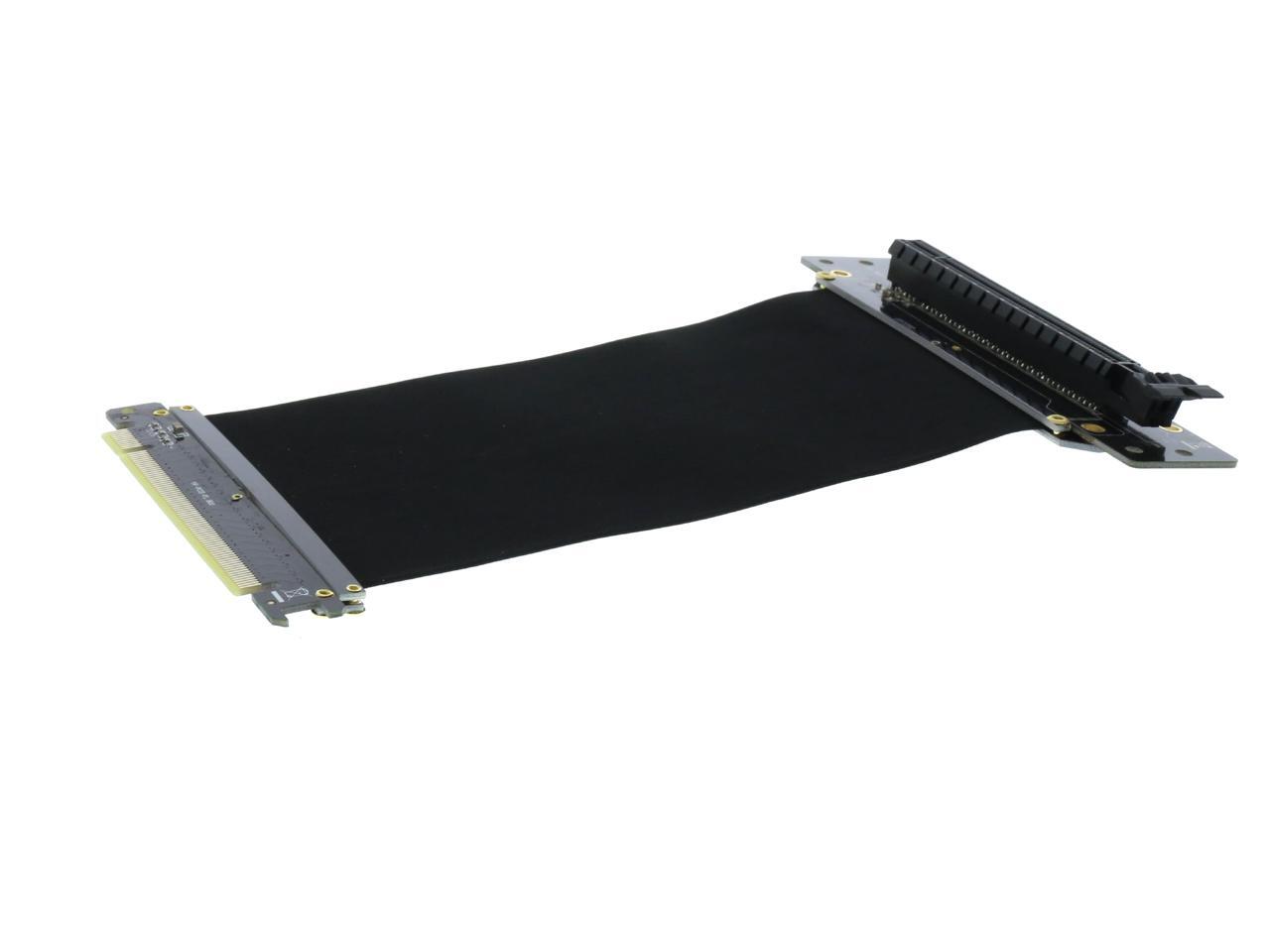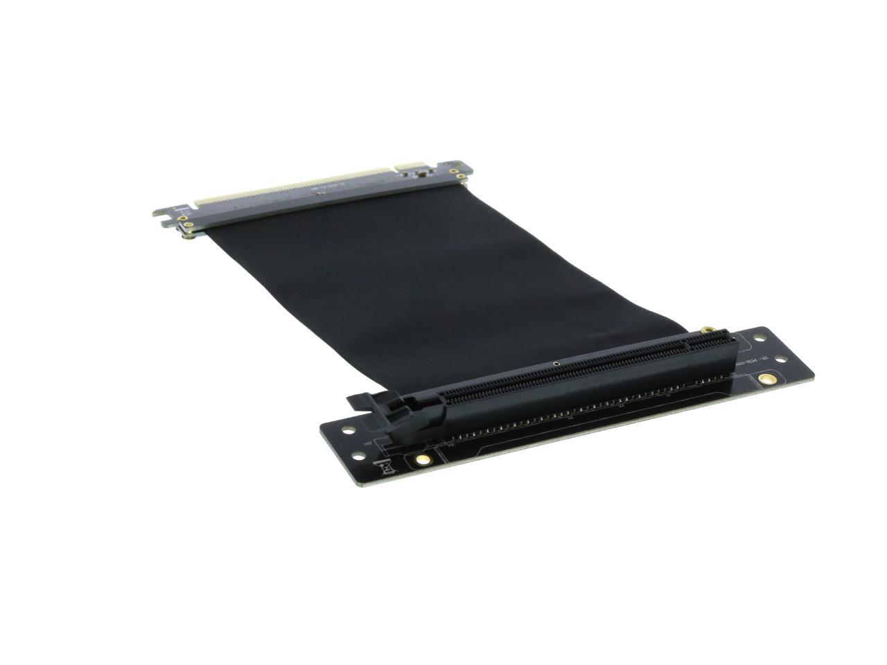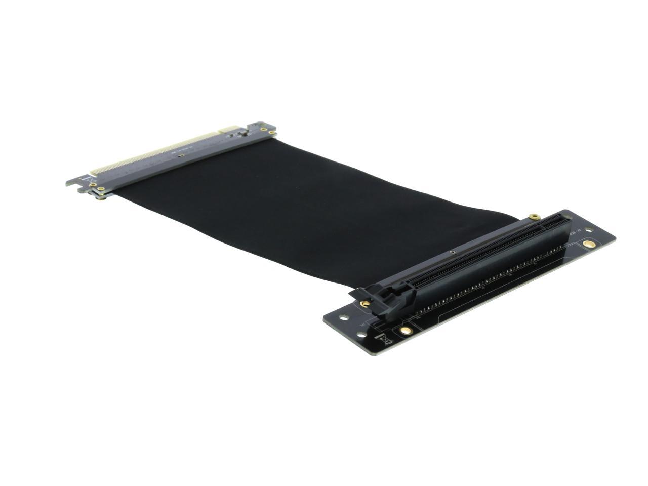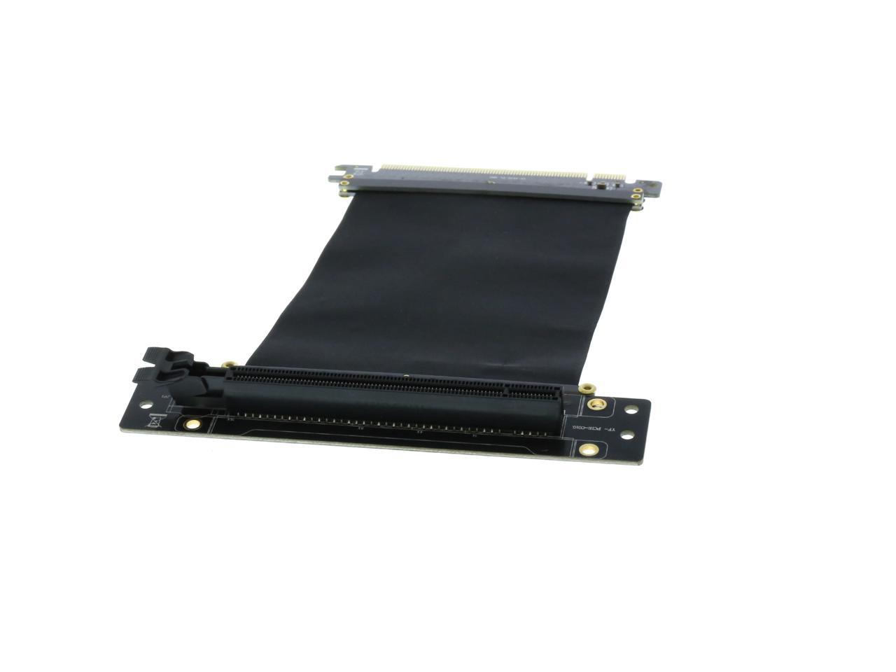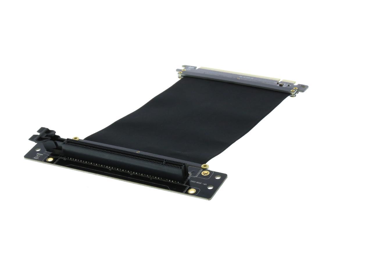 A PCI-E x16 male connector at one end is for connecting to your motherboard, and a PCI-E x16 female 90-degree right angle connector at the other end is for connecting to your graphics card.