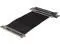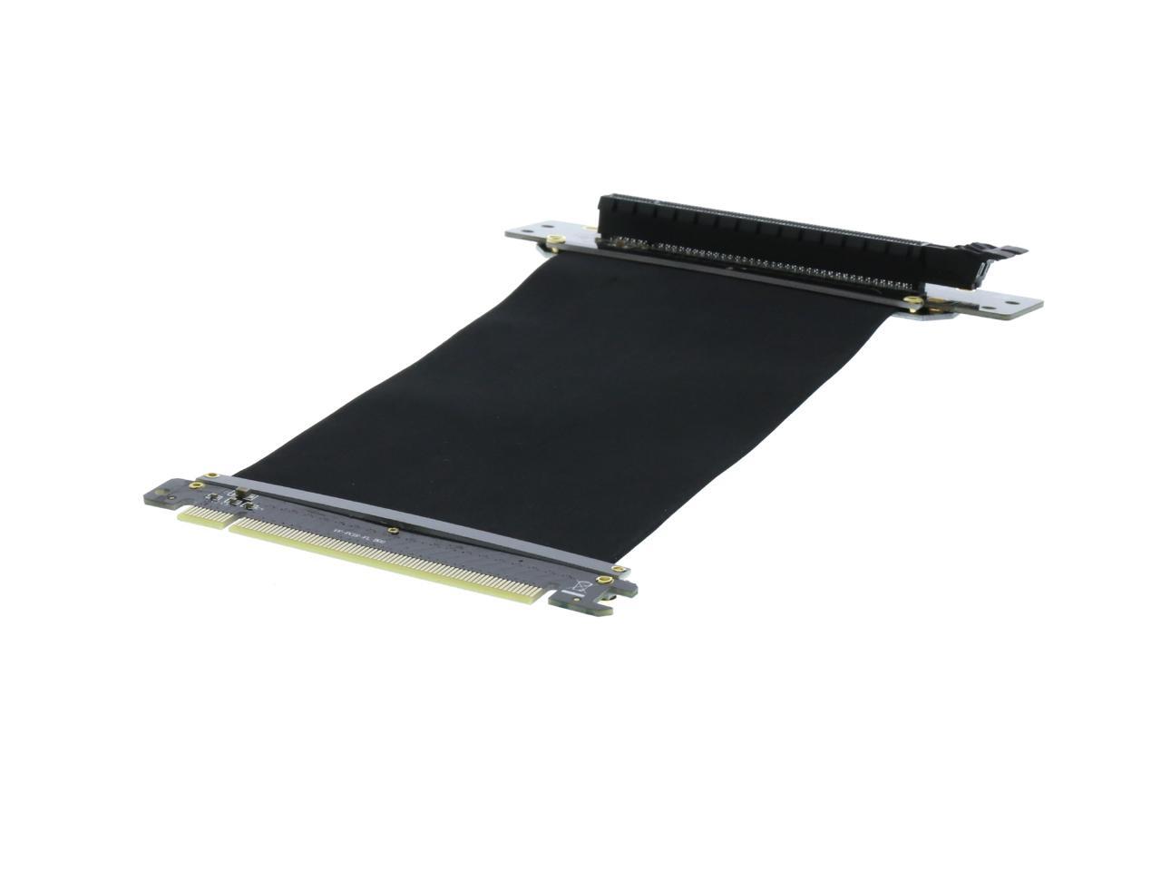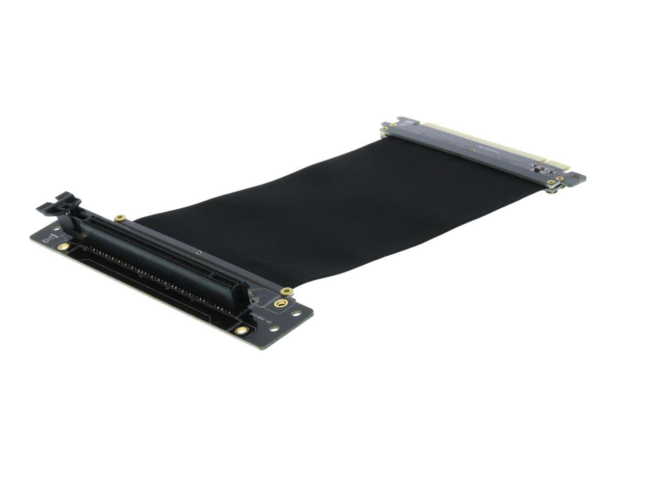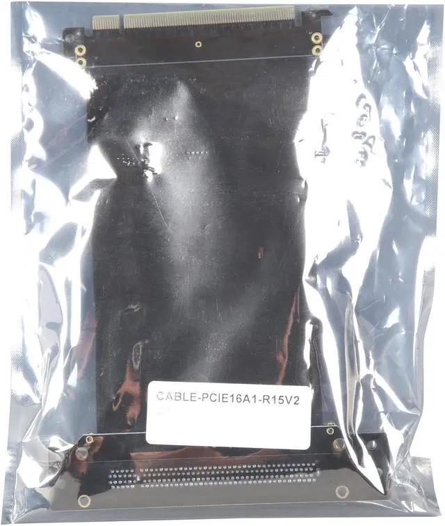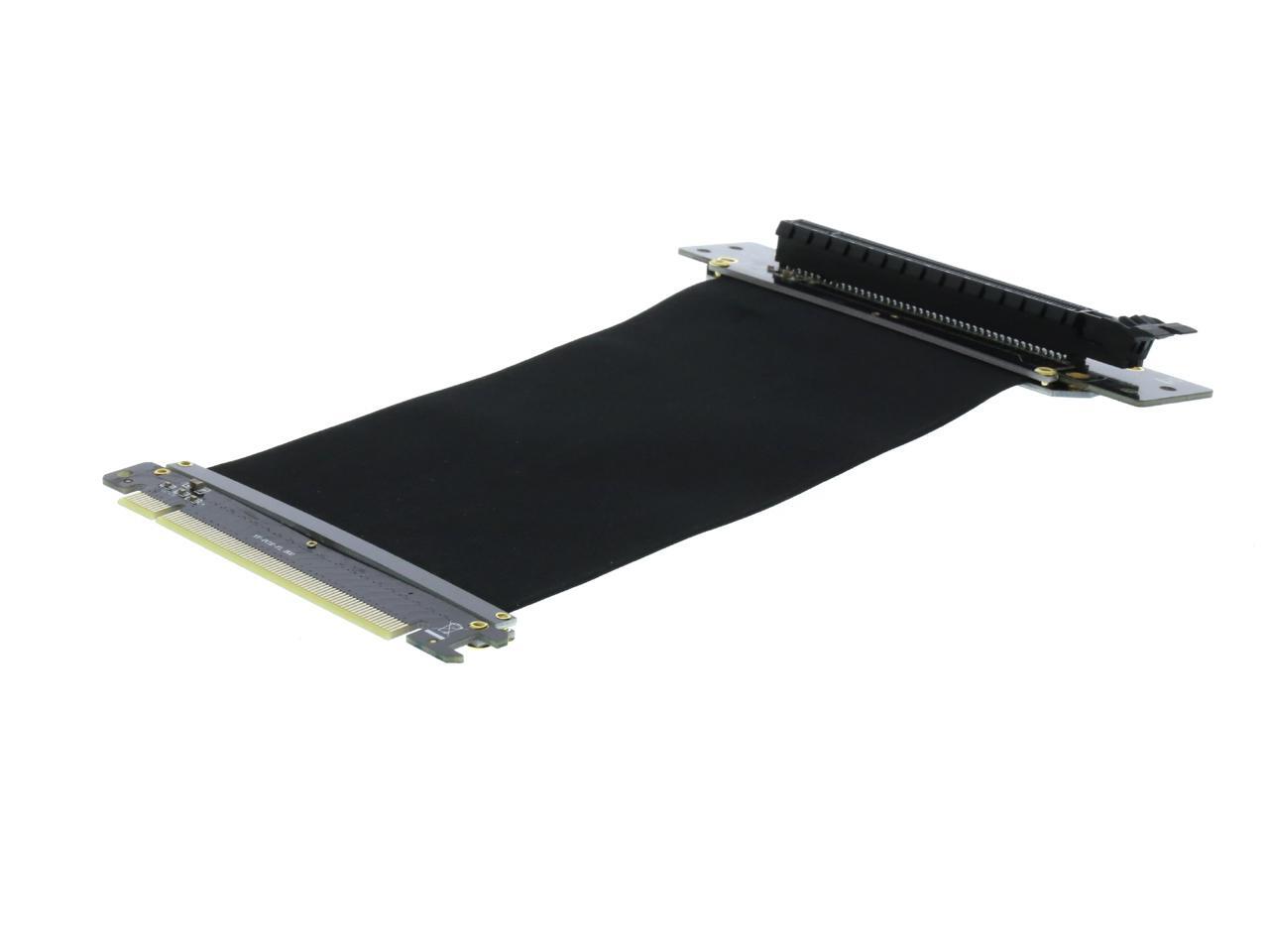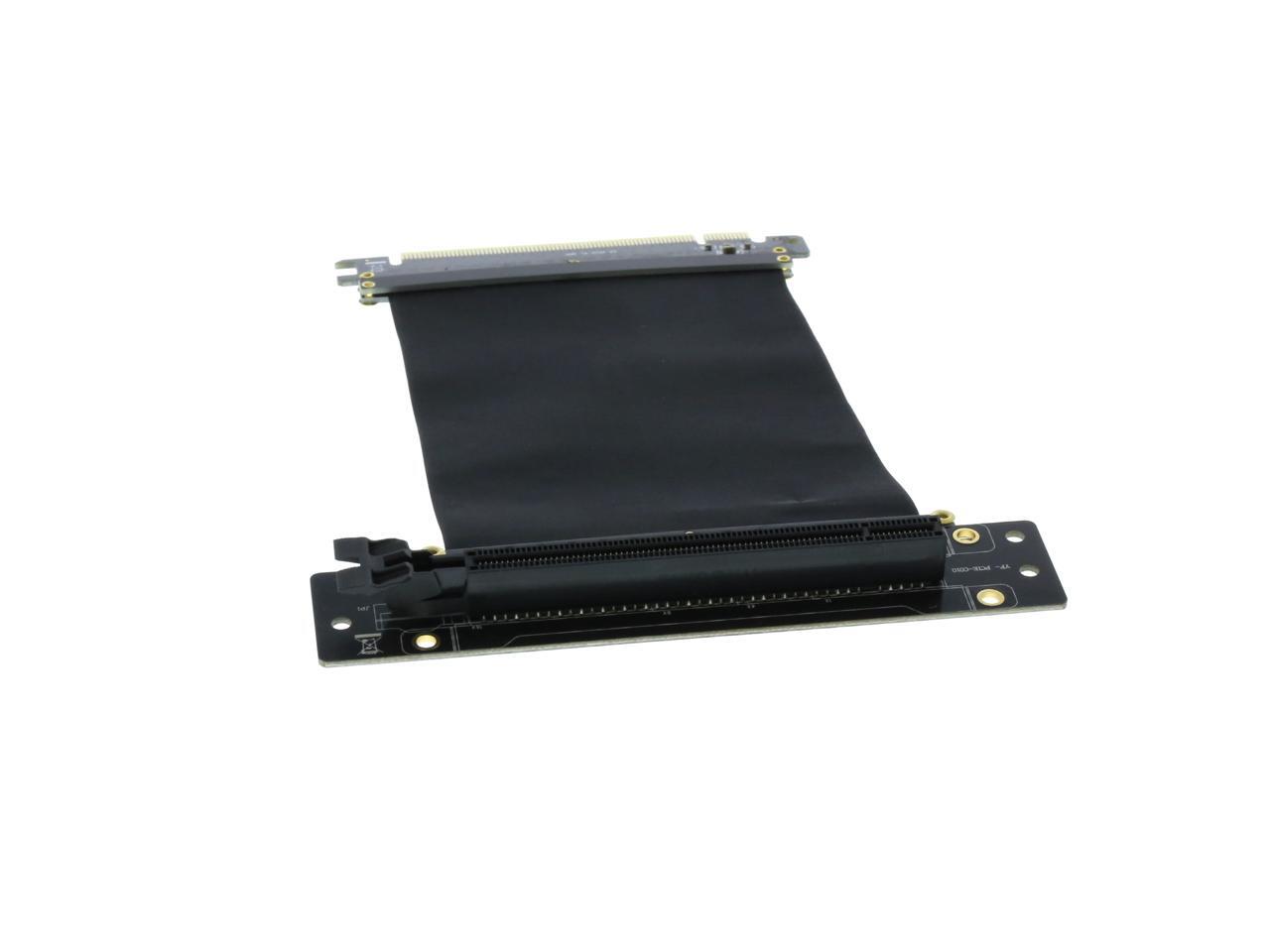 A PCI-E x16 male connector at one end is for connecting to your motherboard, and a PCI-E x16 female 90-degree right angle connector at the other end is for connecting to your graphics card.
