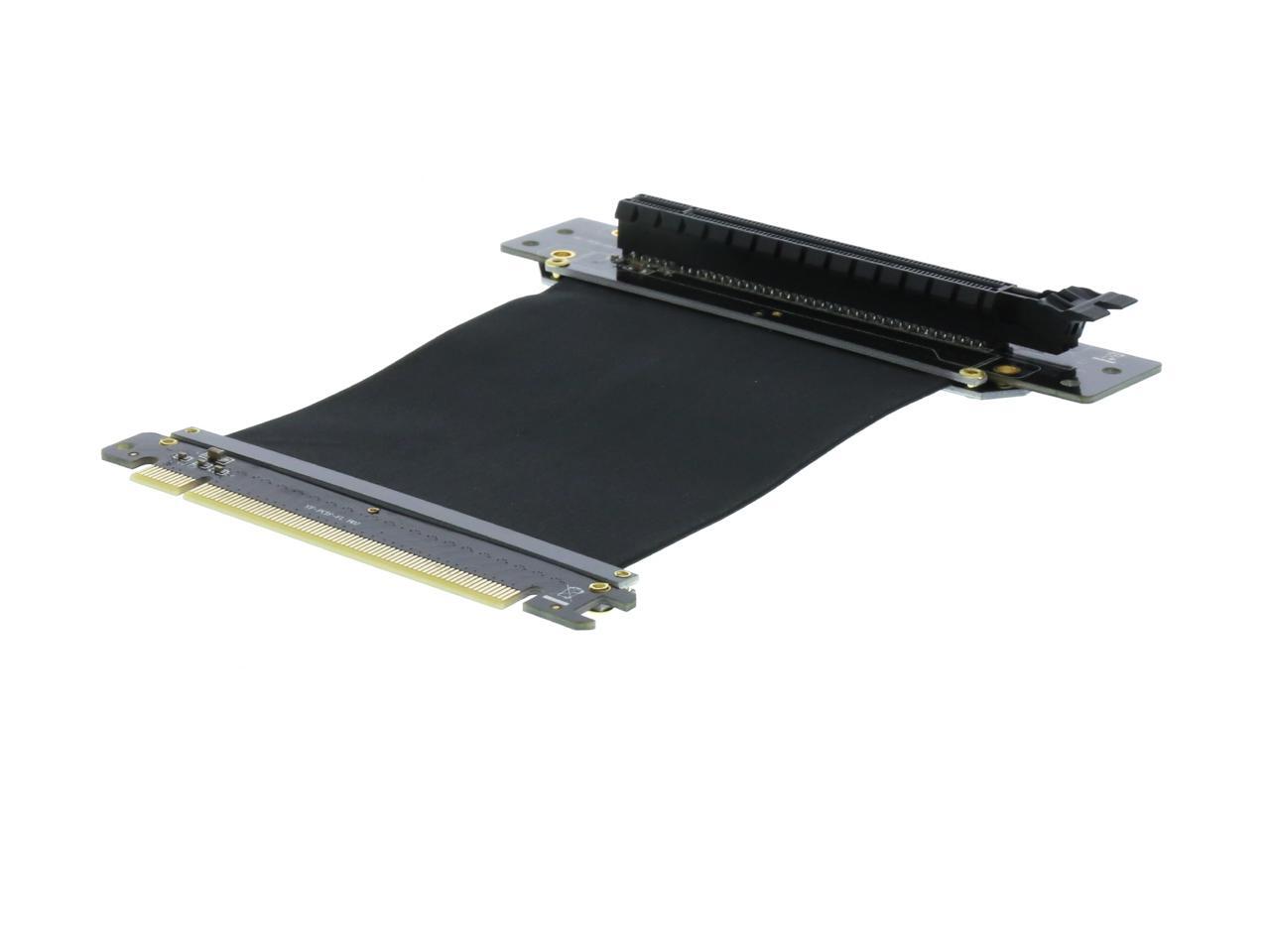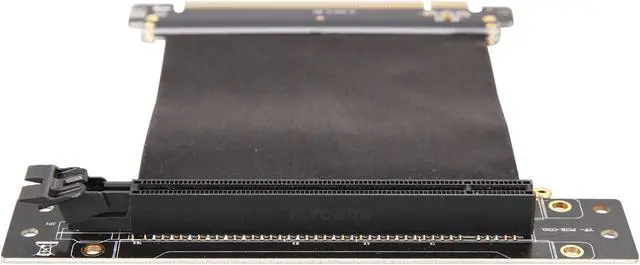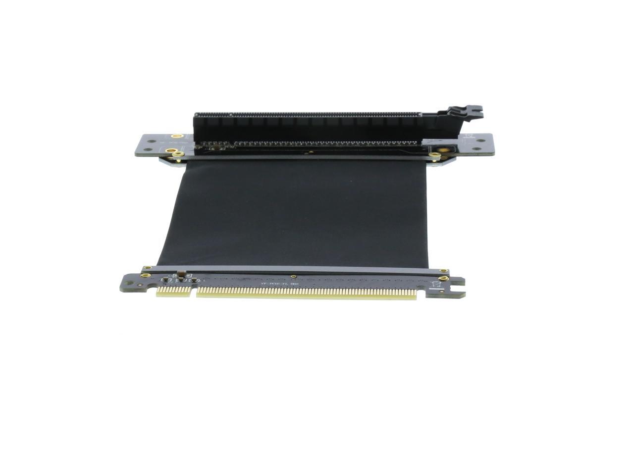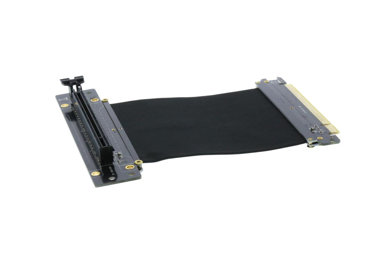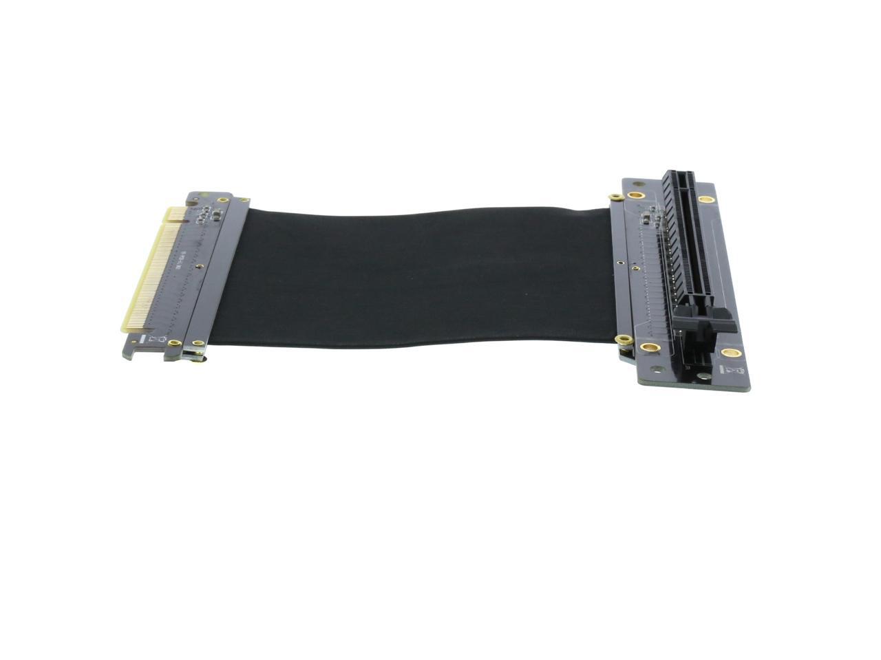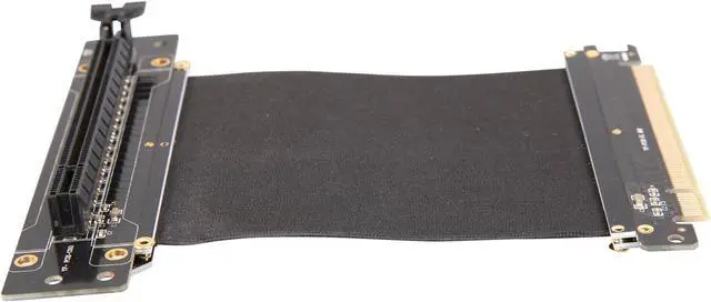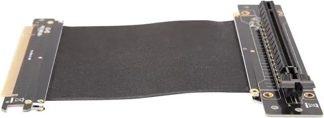 A PCI-E x16 male connector at one end is for connecting to your motherboard, and a PCI-E x16 female 90-degree right angle connector at the other end is for connecting to your graphics card.