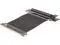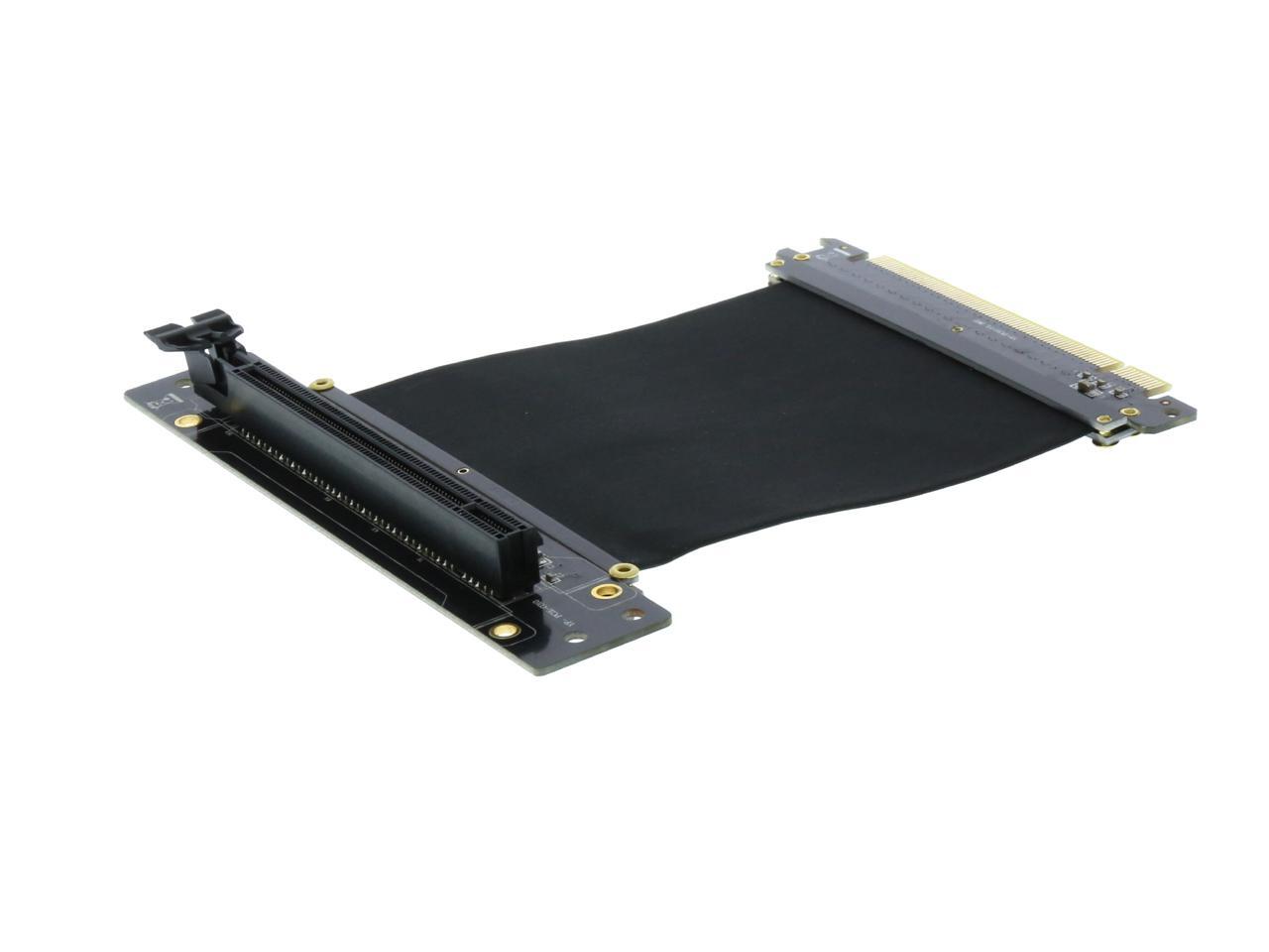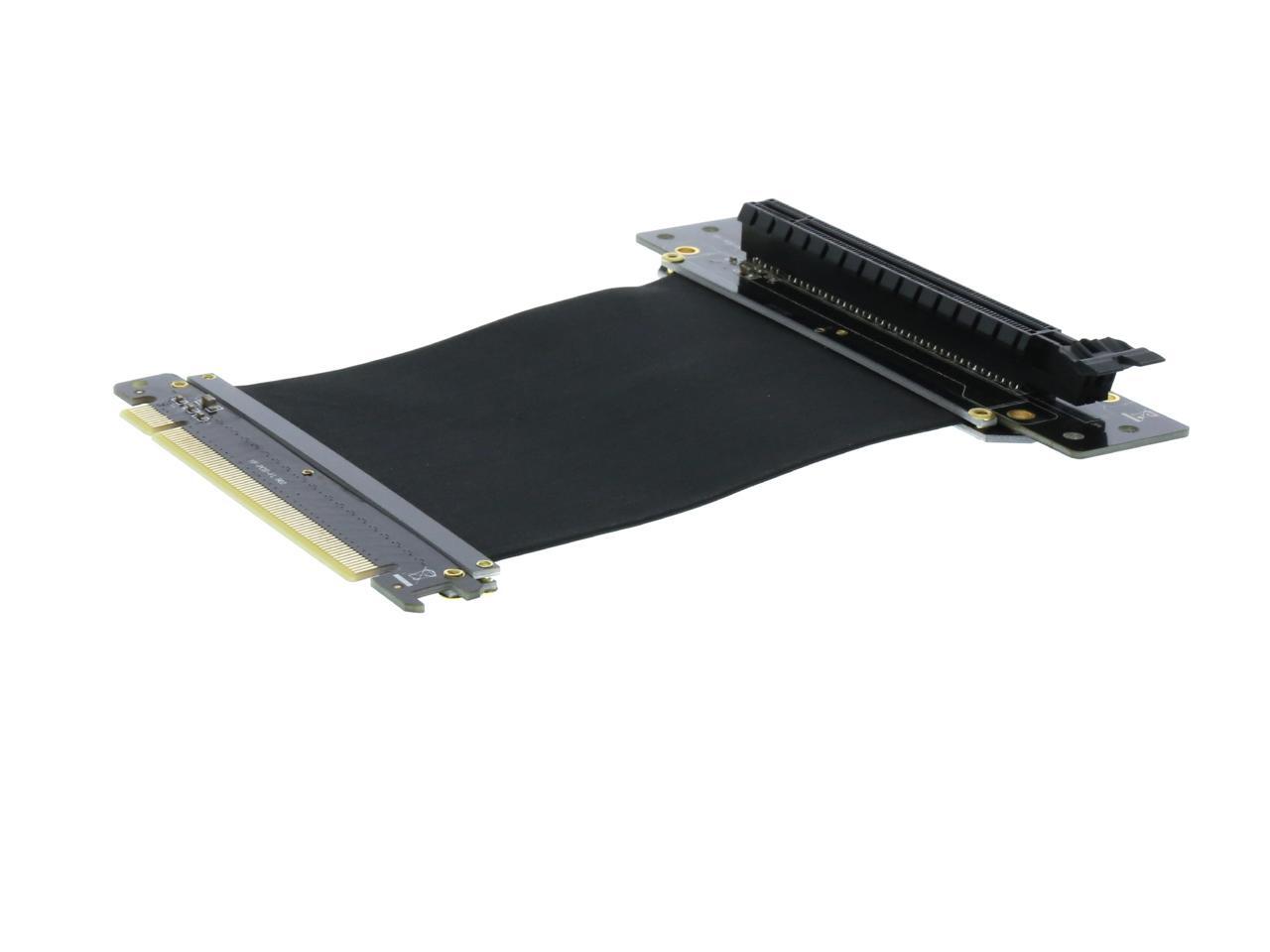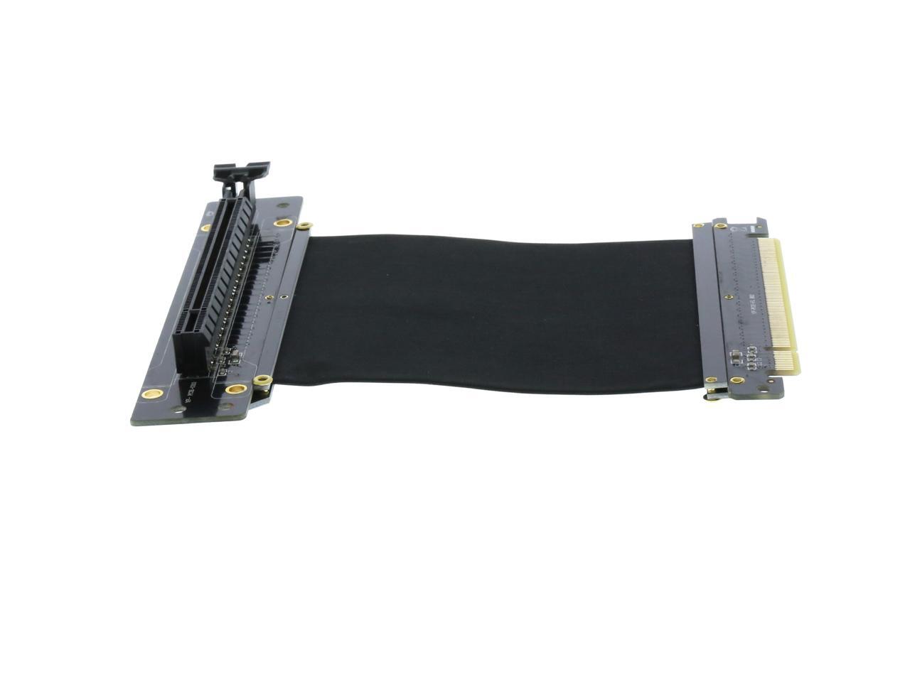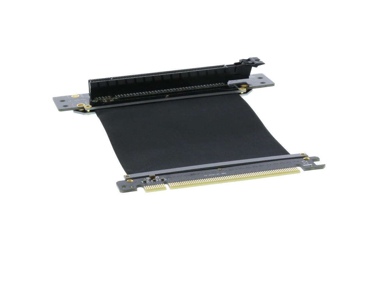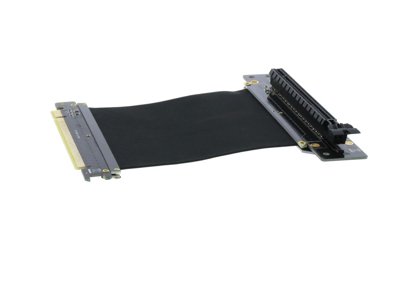 A PCI-E x16 male connector at one end is for connecting to your motherboard, and a PCI-E x16 female 90-degree right angle connector at the other end is for connecting to your graphics card.