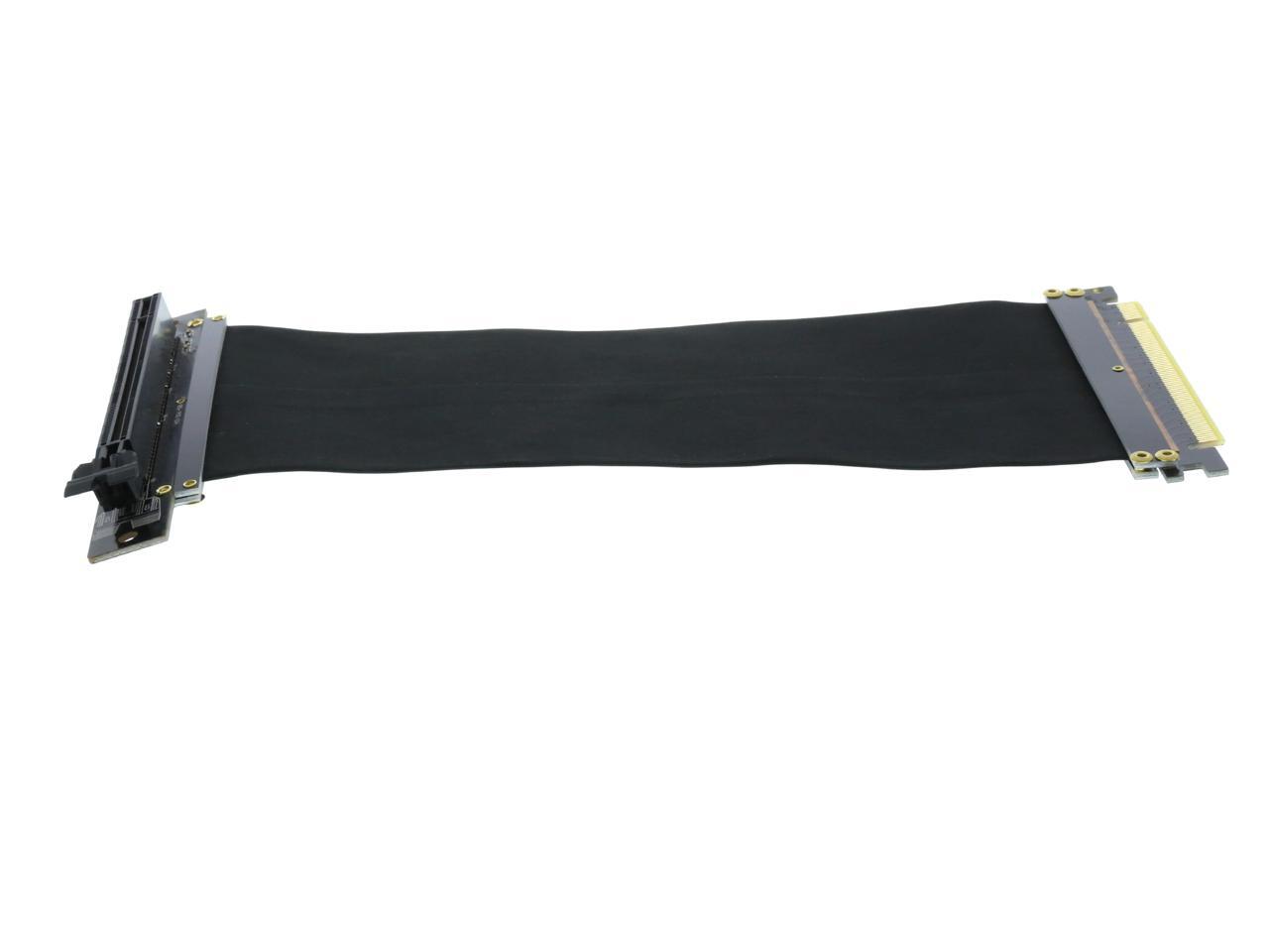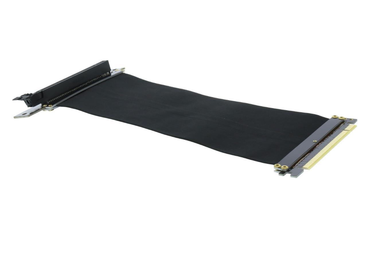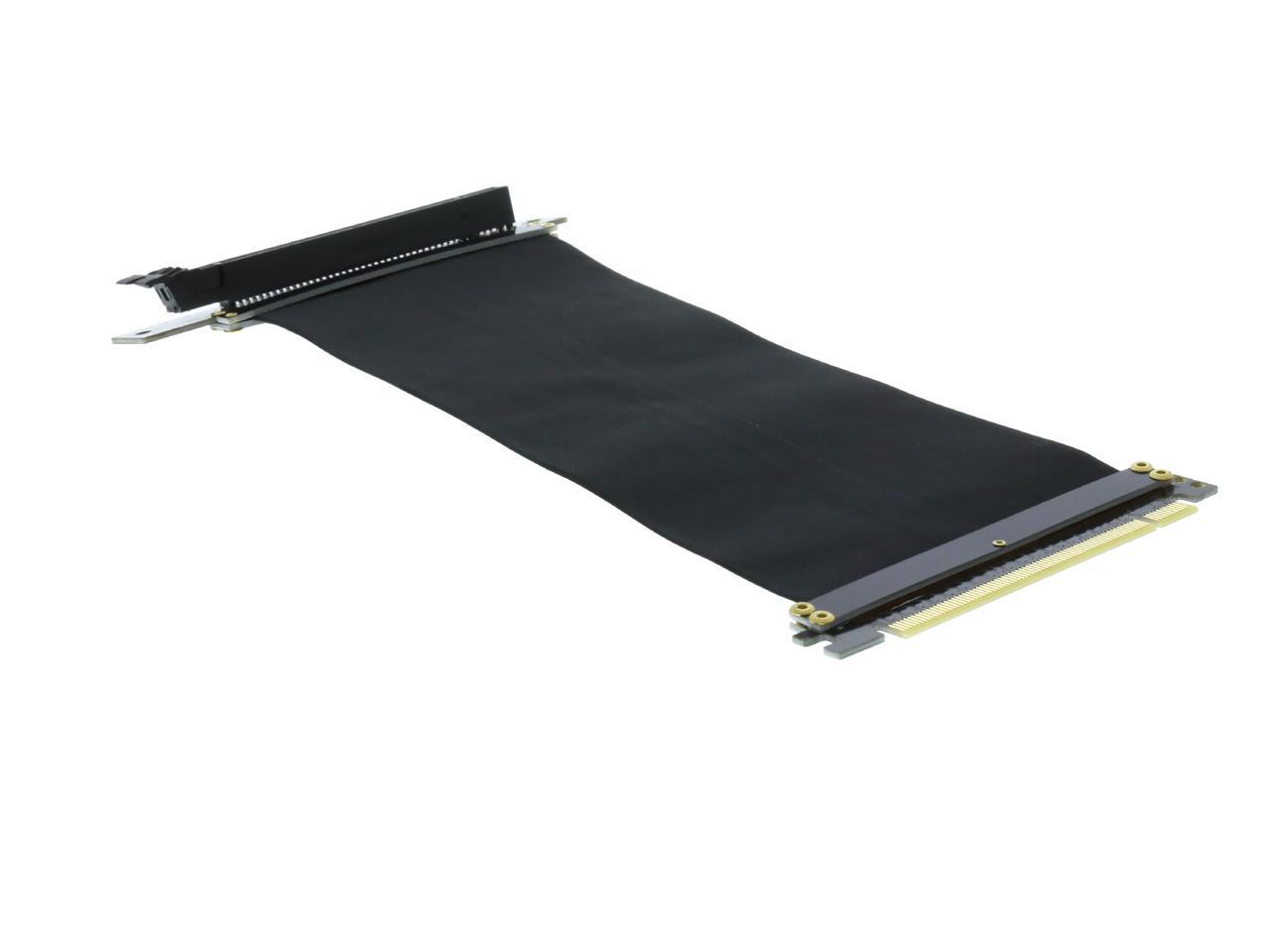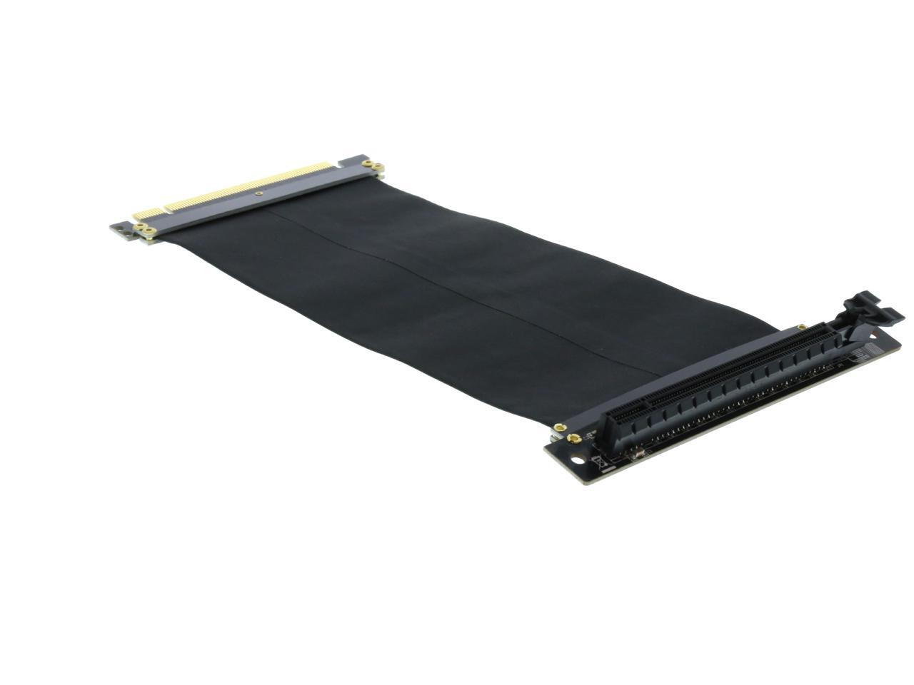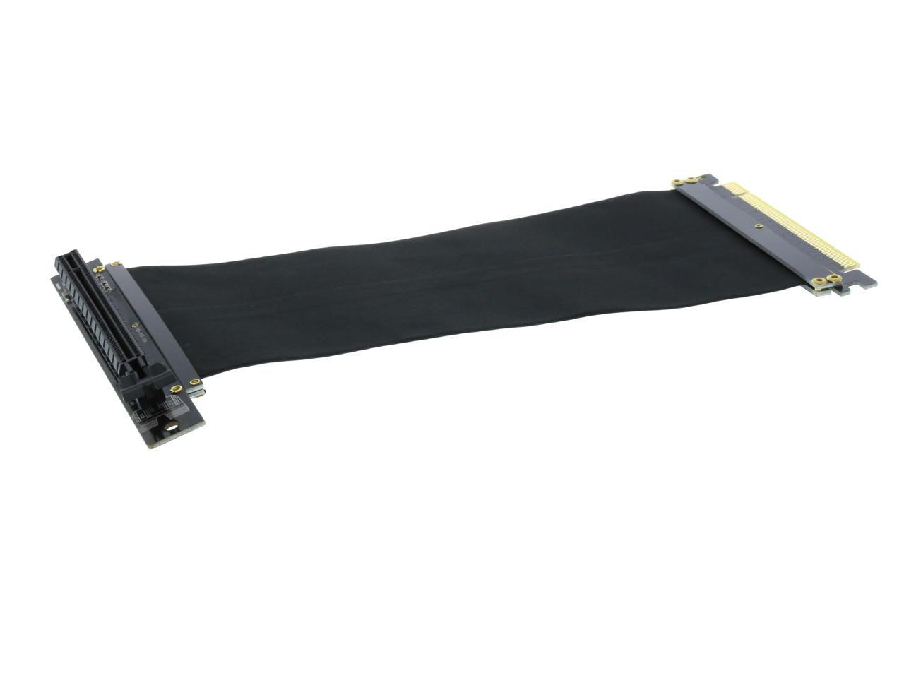 A PCI-E x16 male connector at one end is for connecting to your motherboard, and a PCI-E x16 female 90-degree left angle connector at the other end is for connecting to your graphics card.
