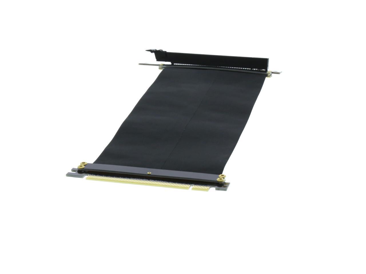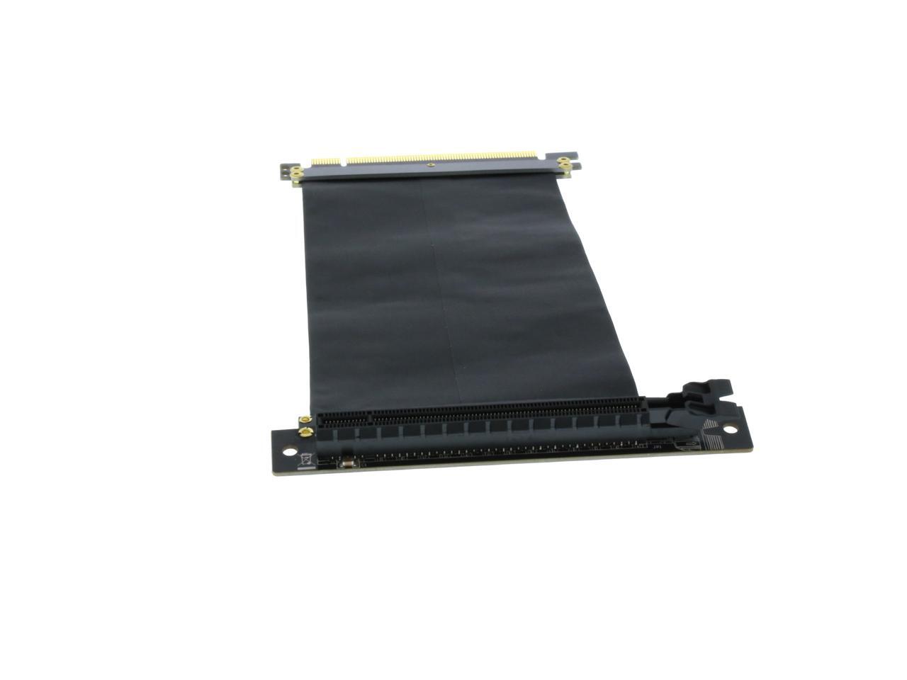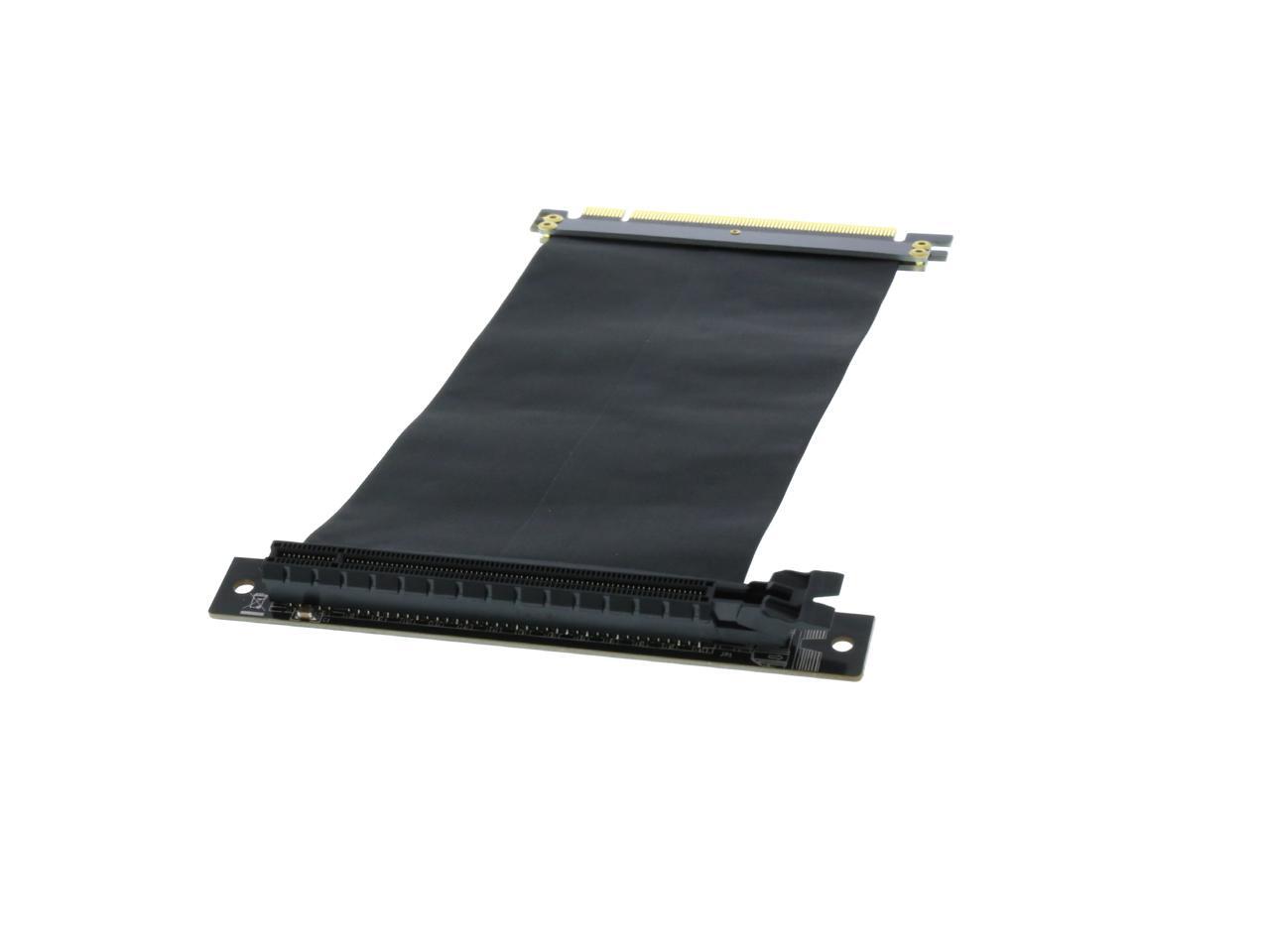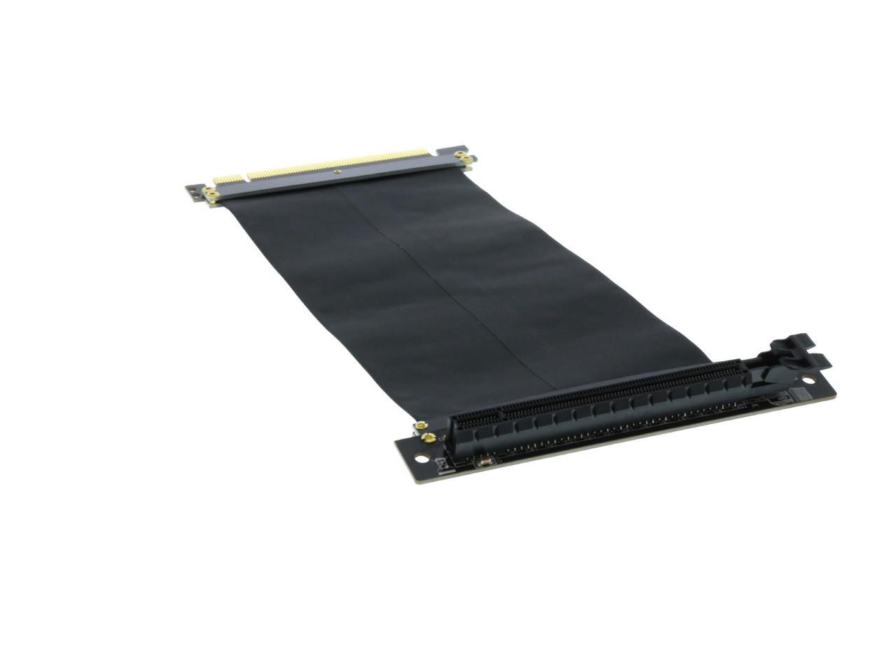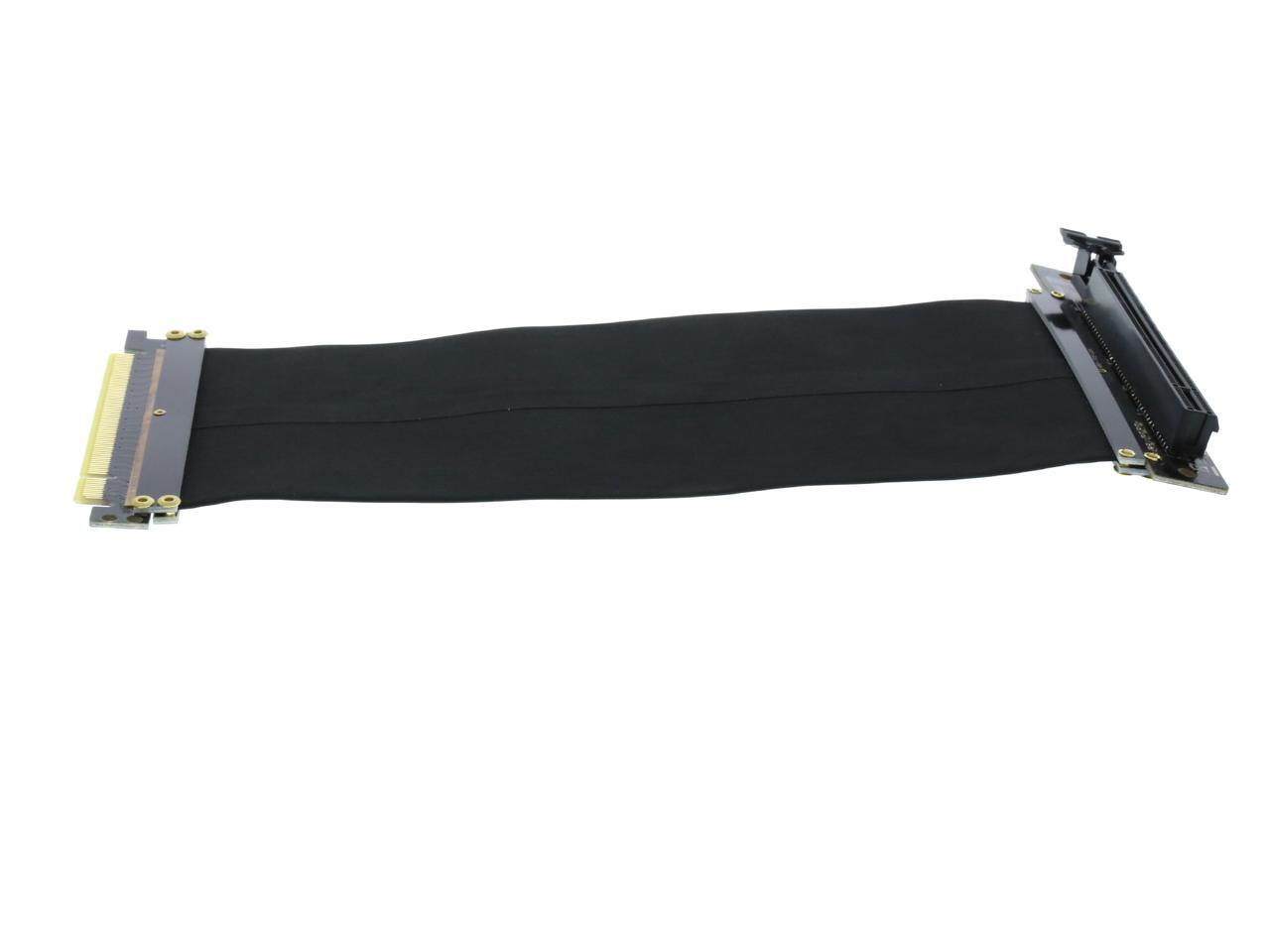 A PCI-E x16 male connector at one end is for connecting to your motherboard, and a PCI-E x16 female 90-degree left angle connector at the other end is for connecting to your graphics card.