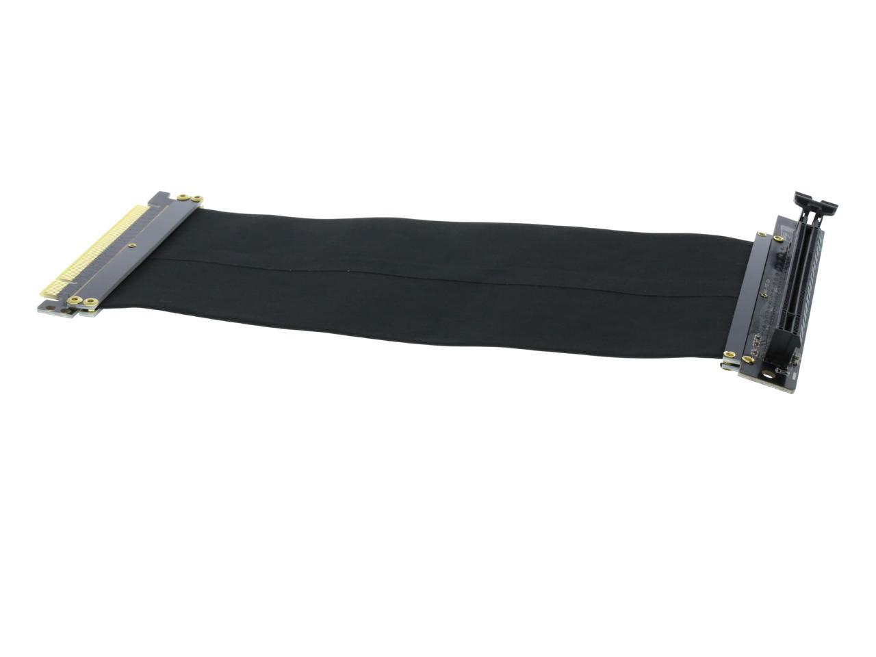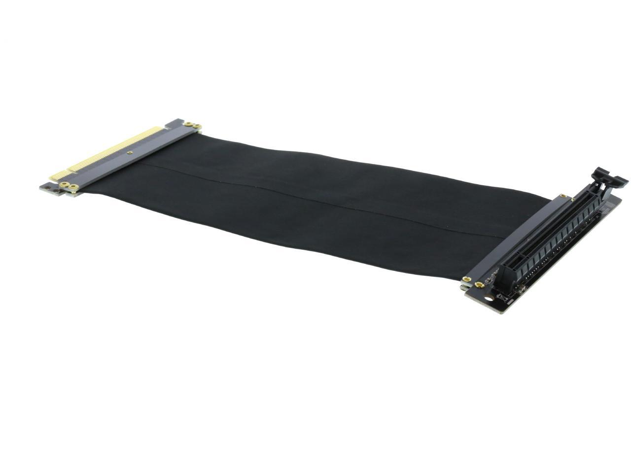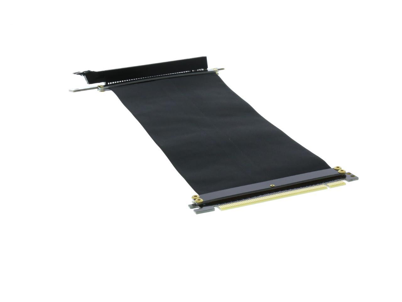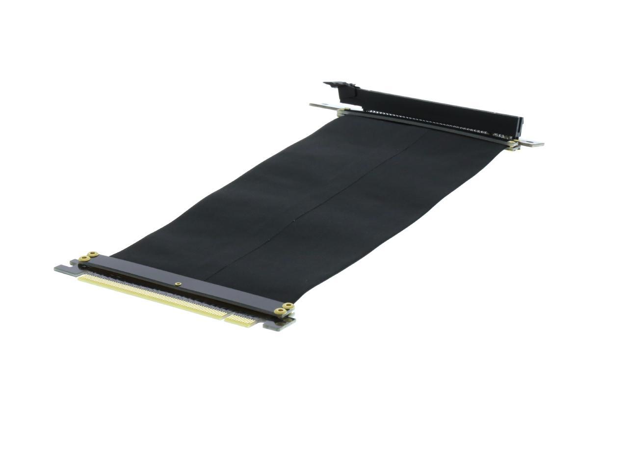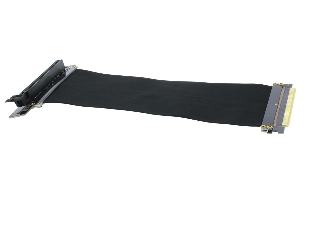 A PCI-E x16 male connector at one end is for connecting to your motherboard, and a PCI-E x16 female 90-degree left angle connector at the other end is for connecting to your graphics card.