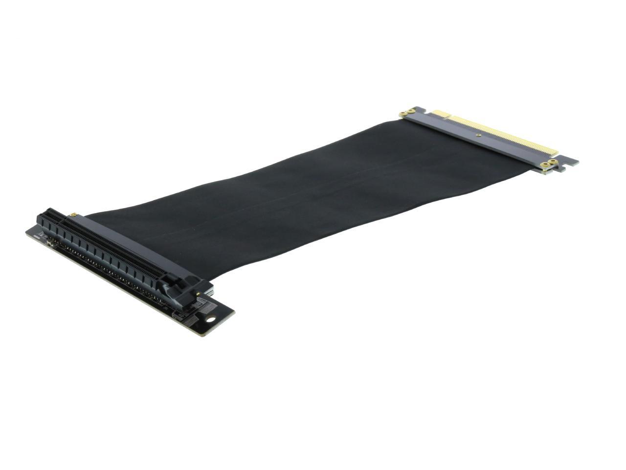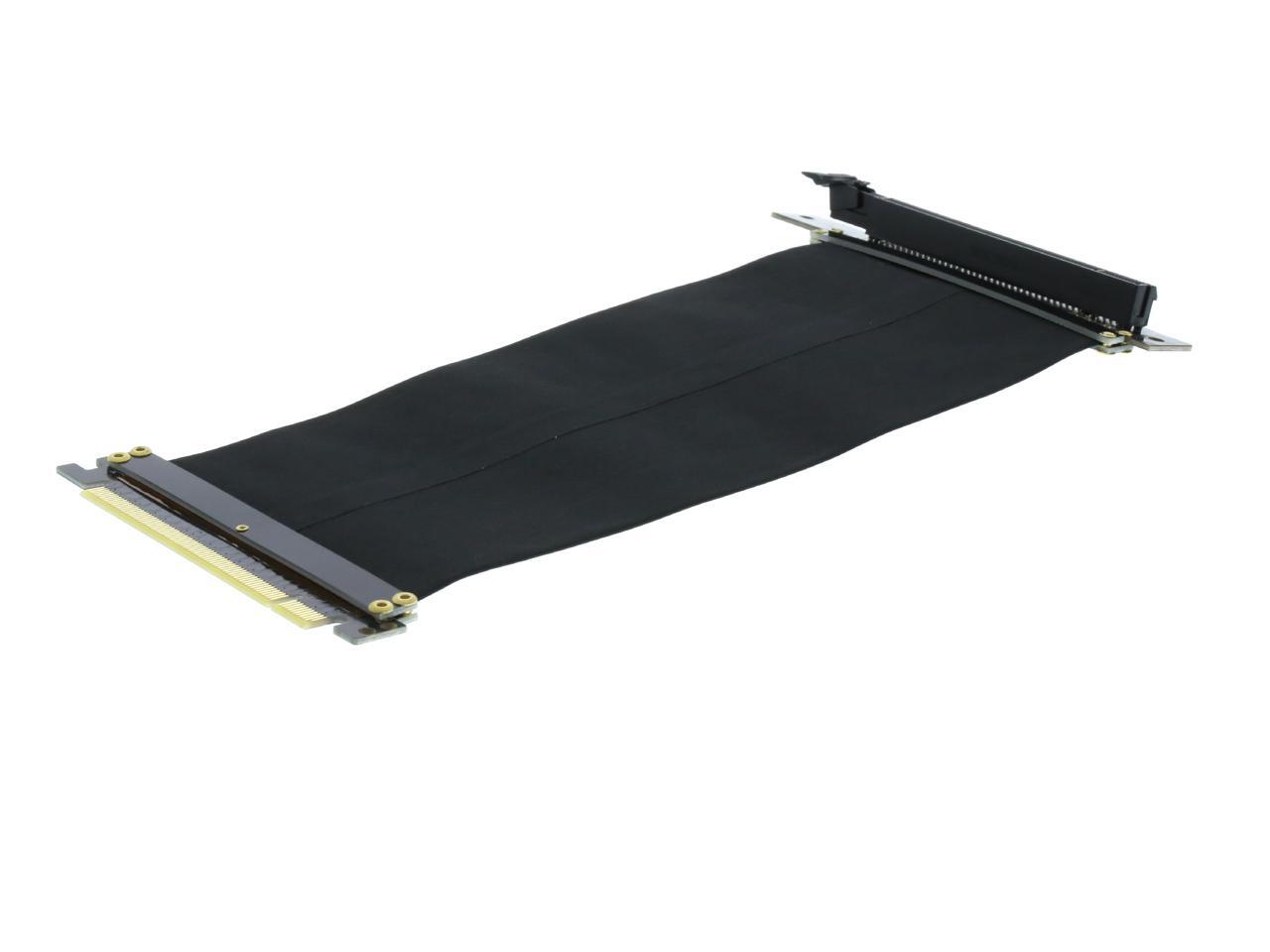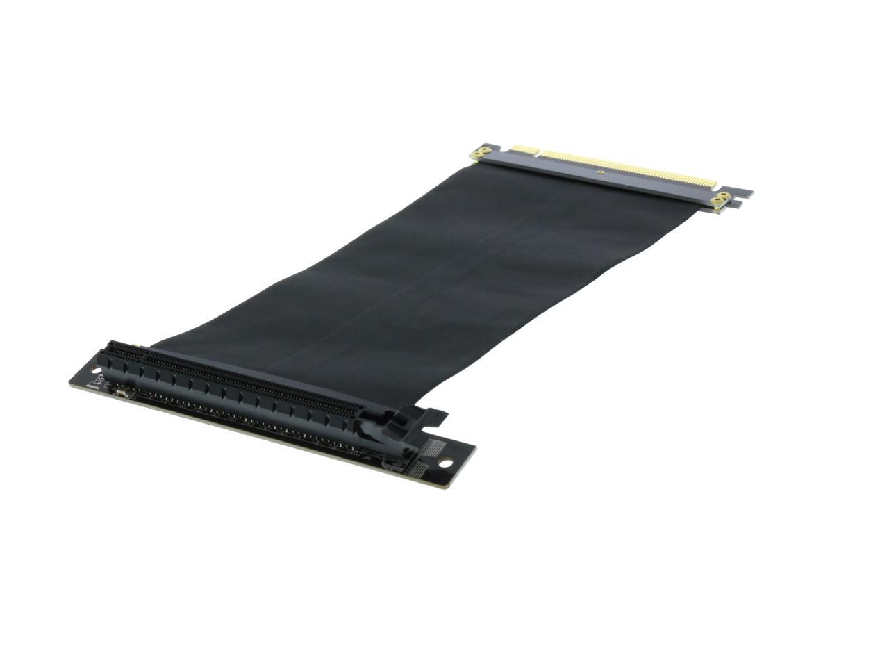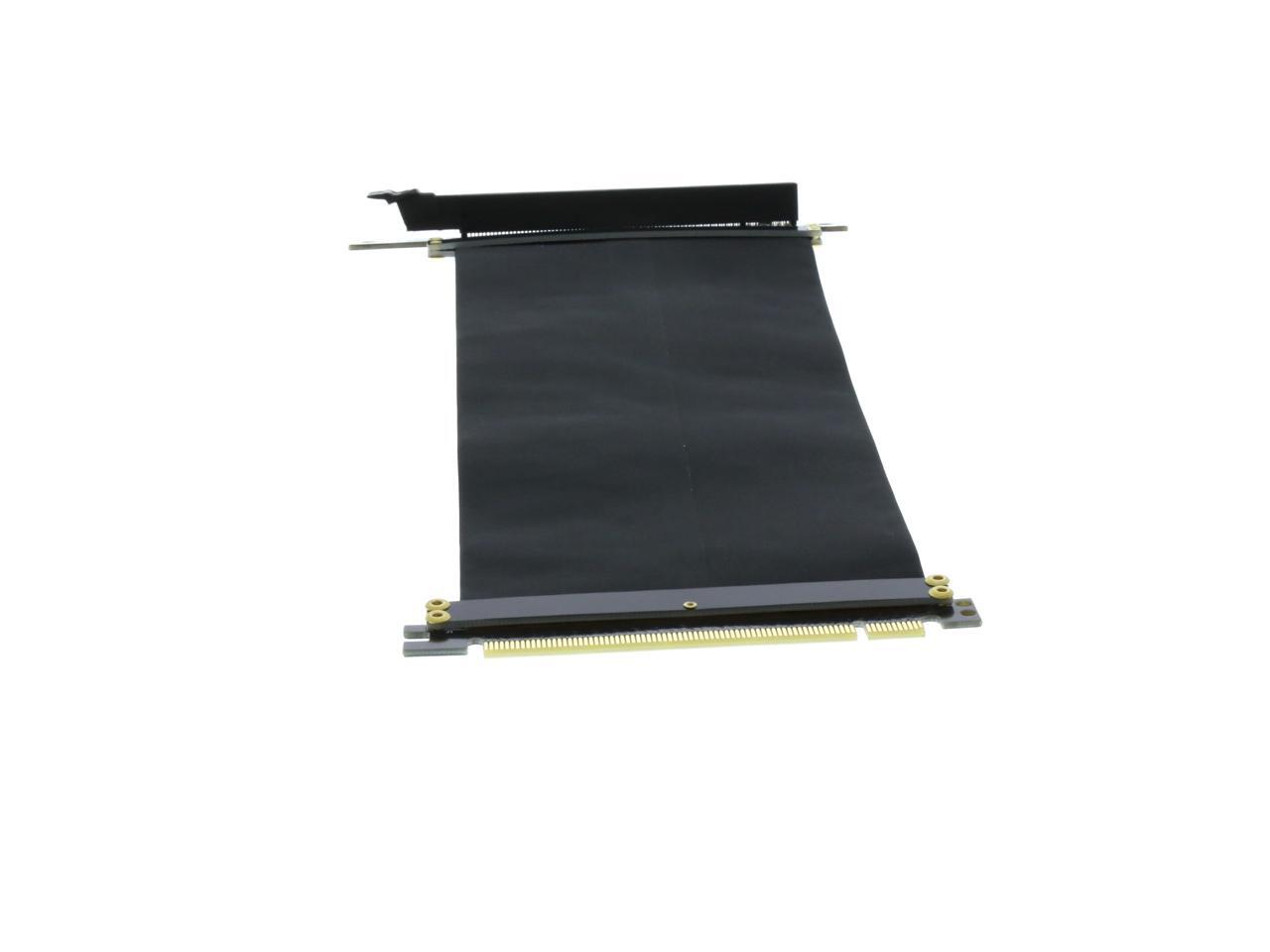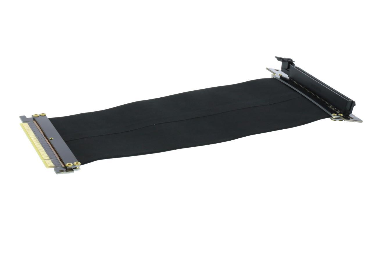 A PCI-E x16 male connector at one end is for connecting to your motherboard, and a PCI-E x16 female 90-degree left angle connector at the other end is for connecting to your graphics card.