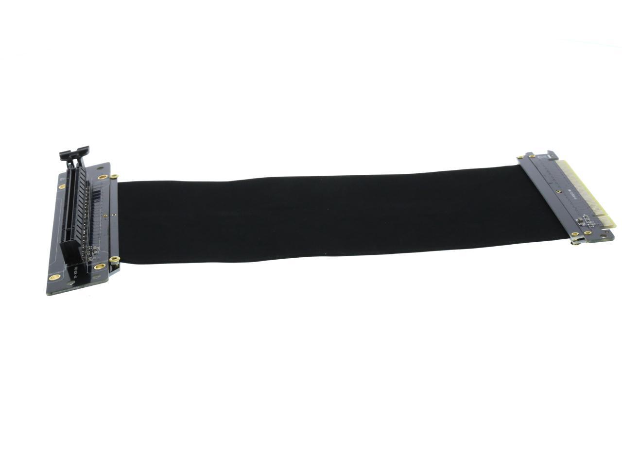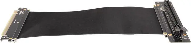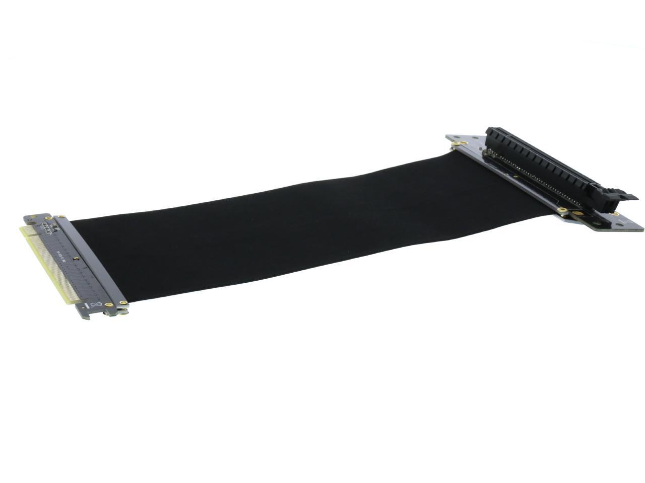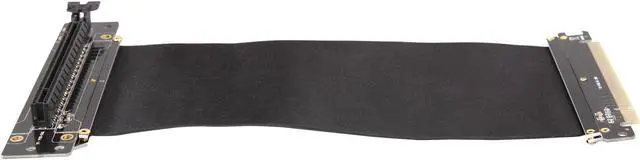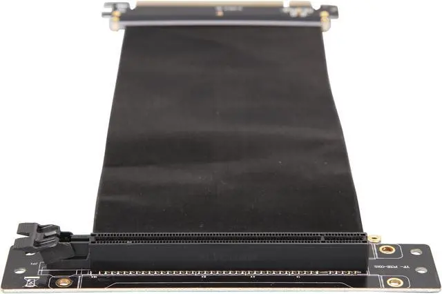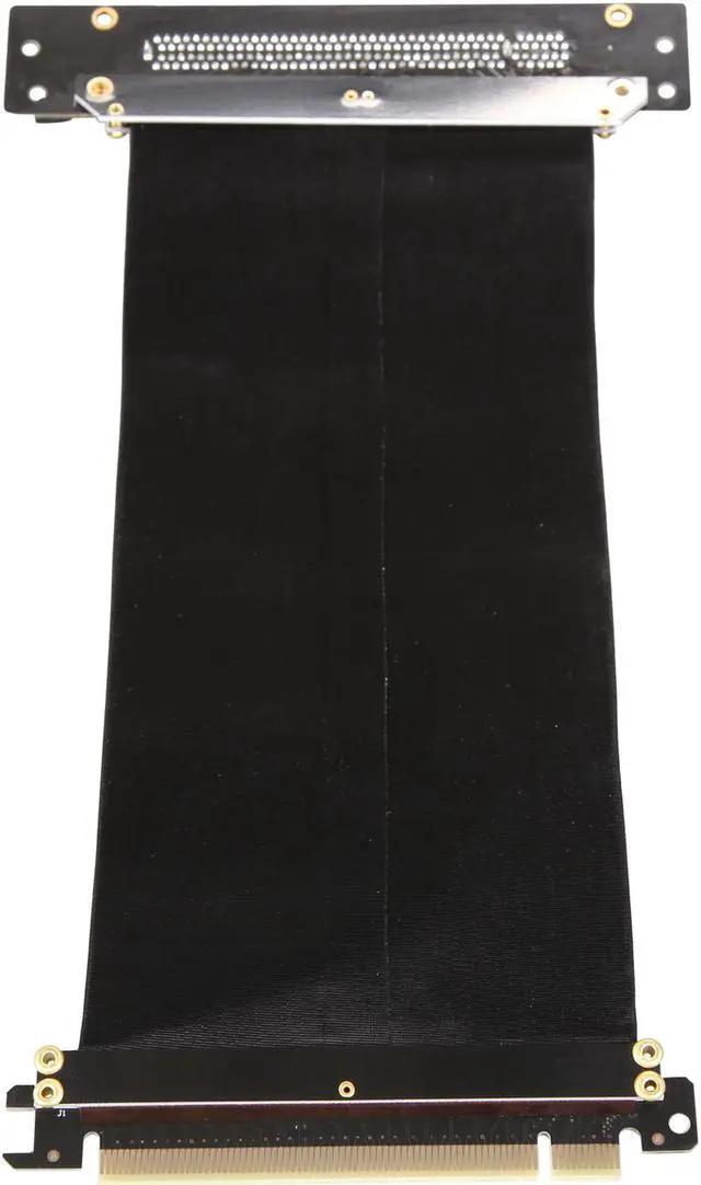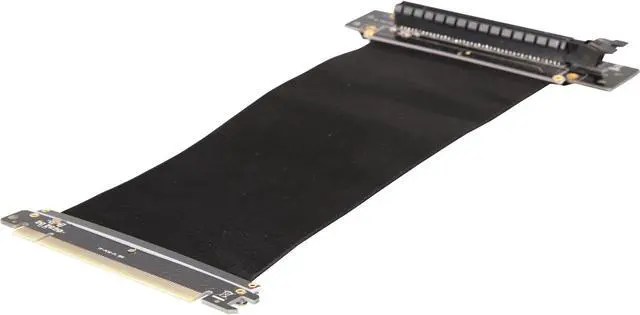 A PCI-E x16 male connector at one end is for connecting to your motherboard, and a PCI-E x16 female 90-degree right angle connector at the other end is for connecting to your graphics card.