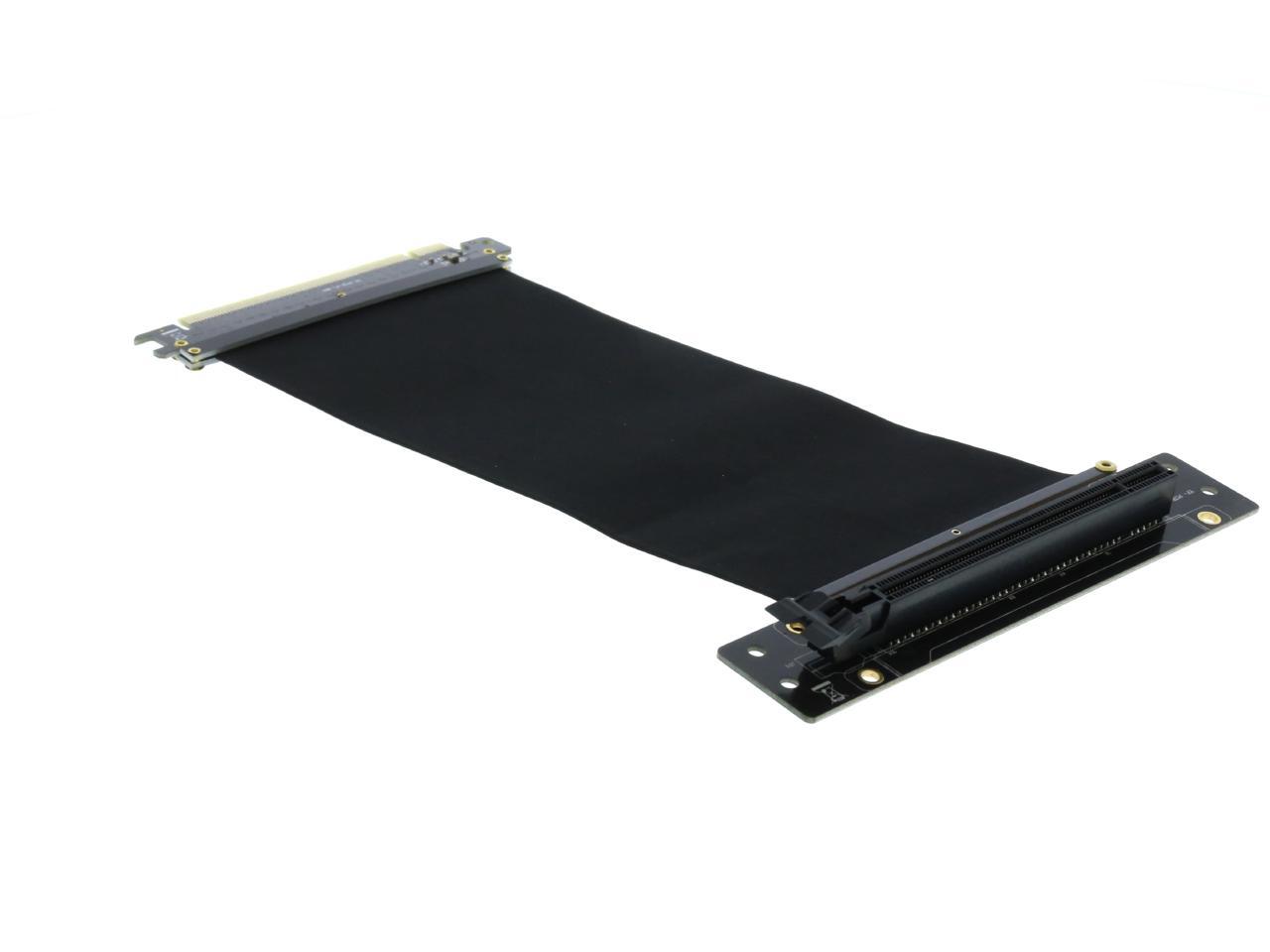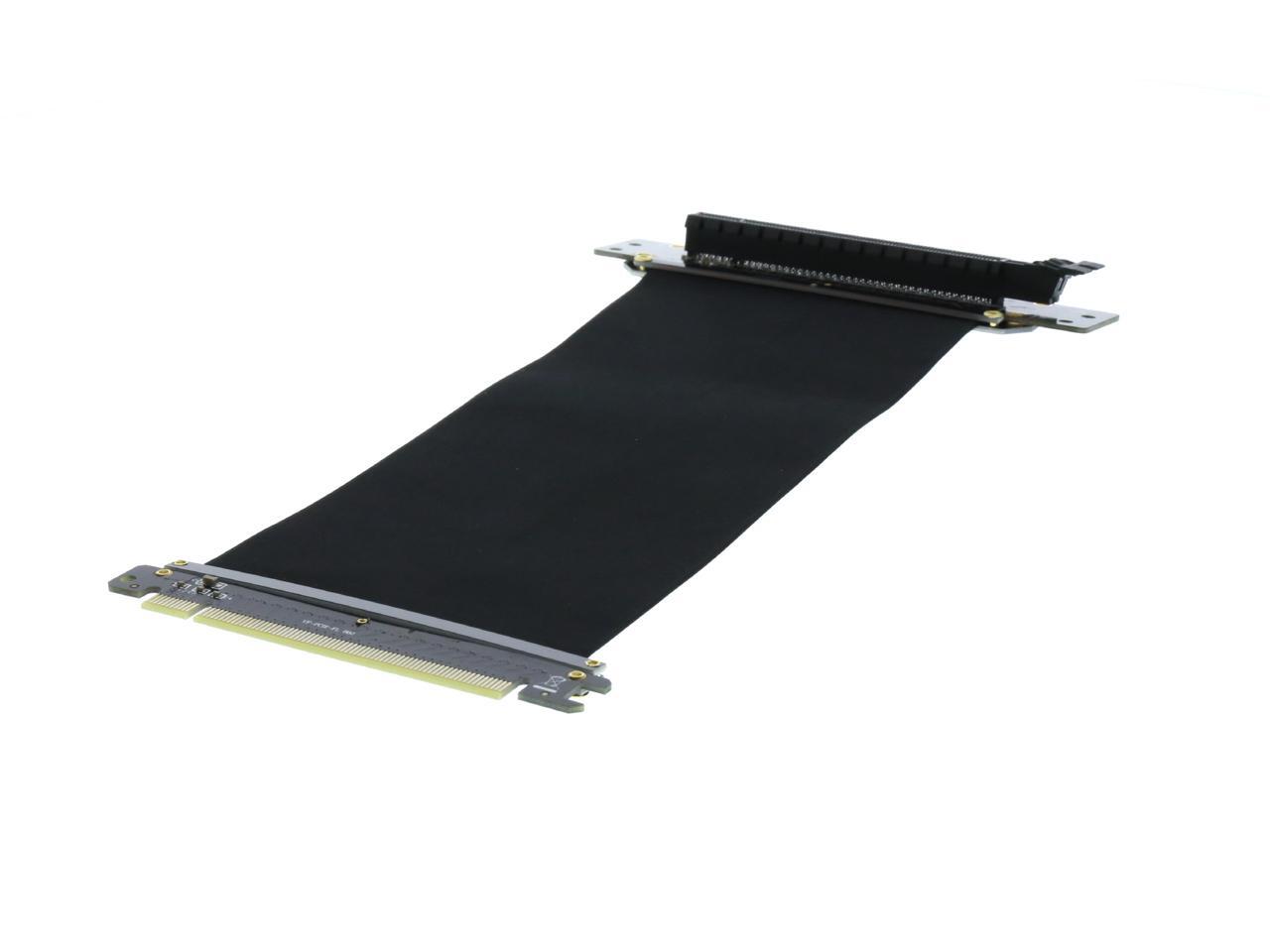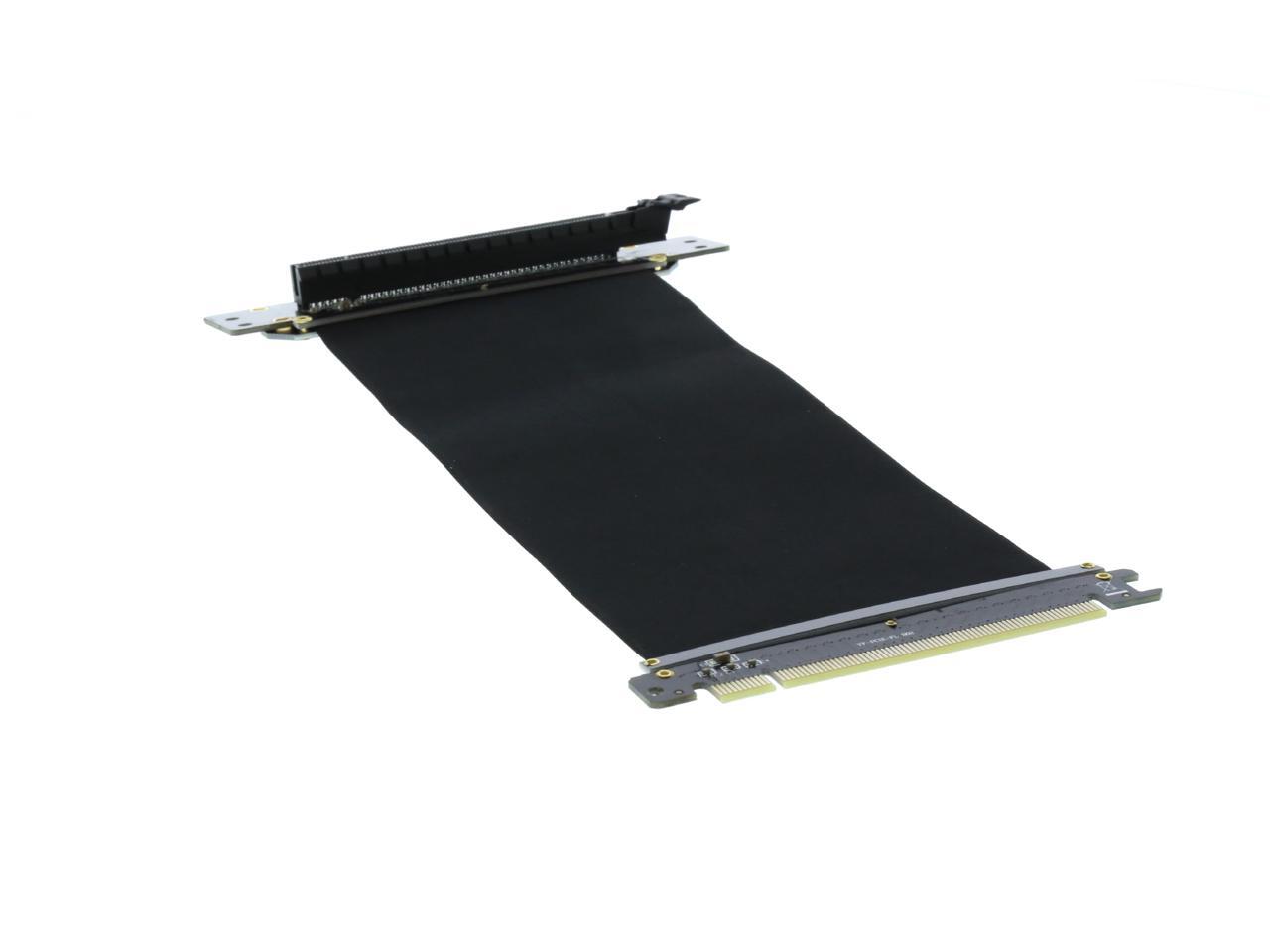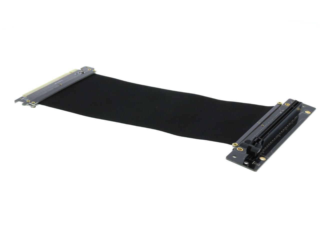 A PCI-E x16 male connector at one end is for connecting to your motherboard, and a PCI-E x16 female 90-degree right angle connector at the other end is for connecting to your graphics card.