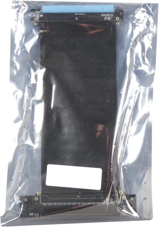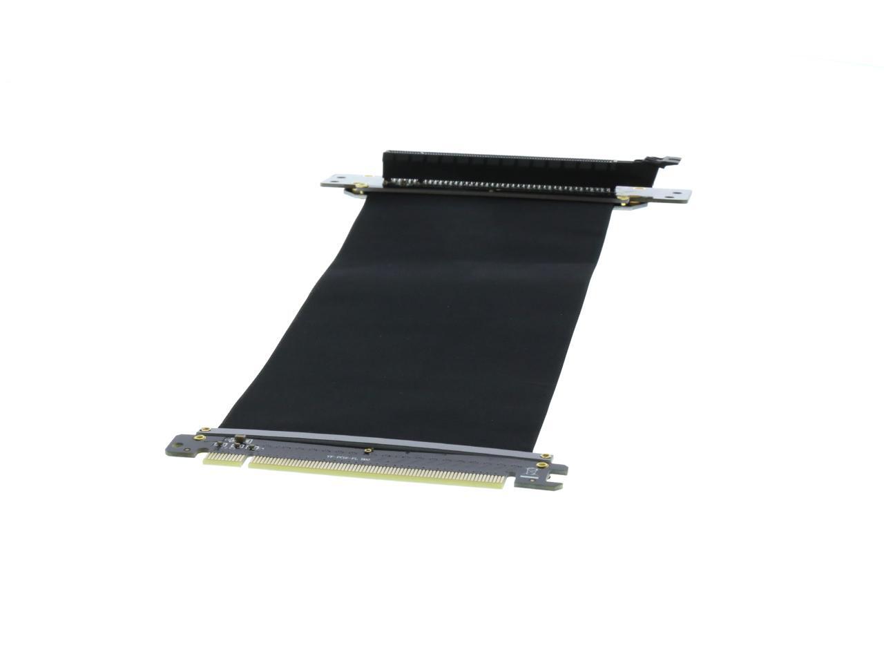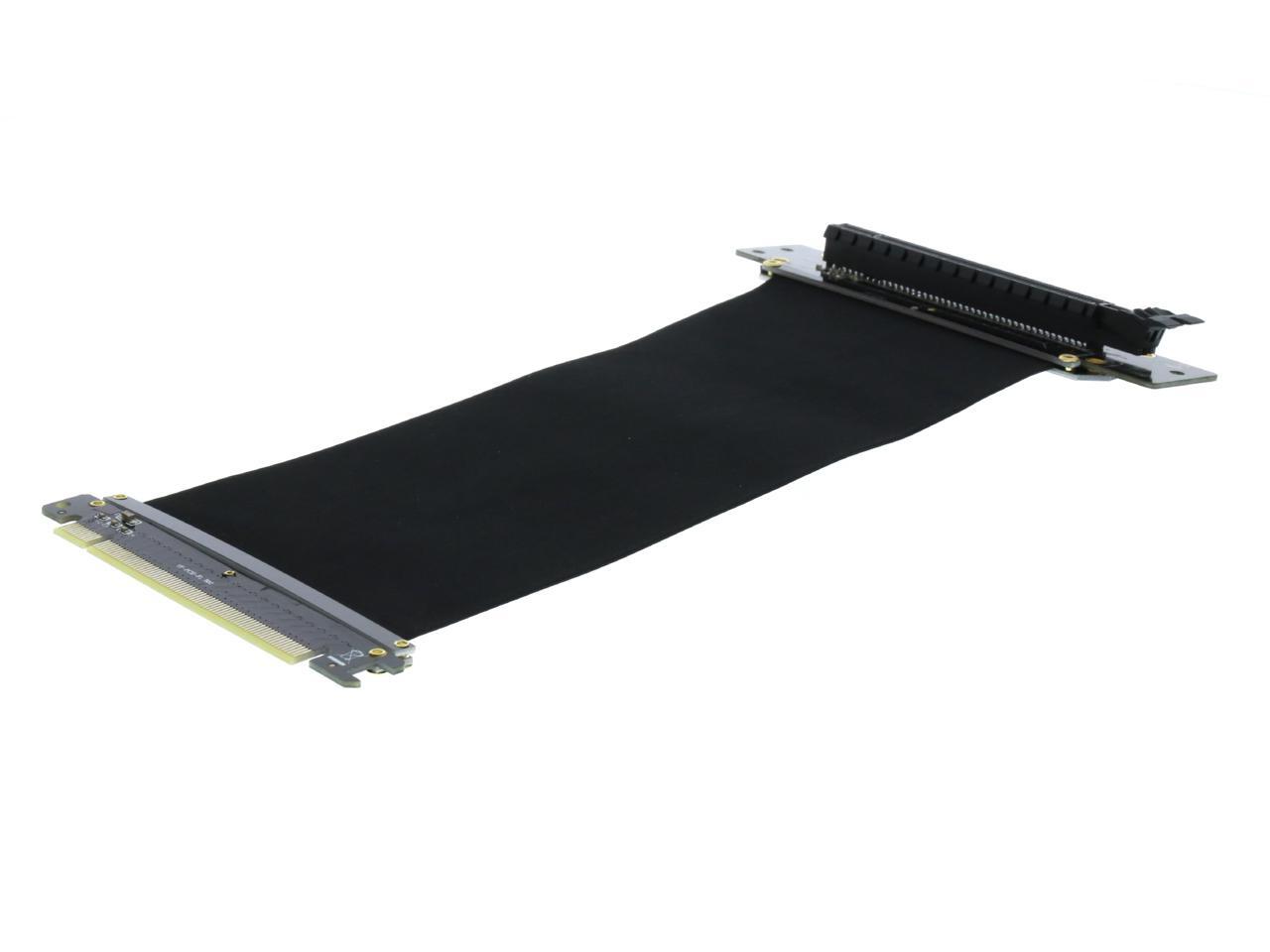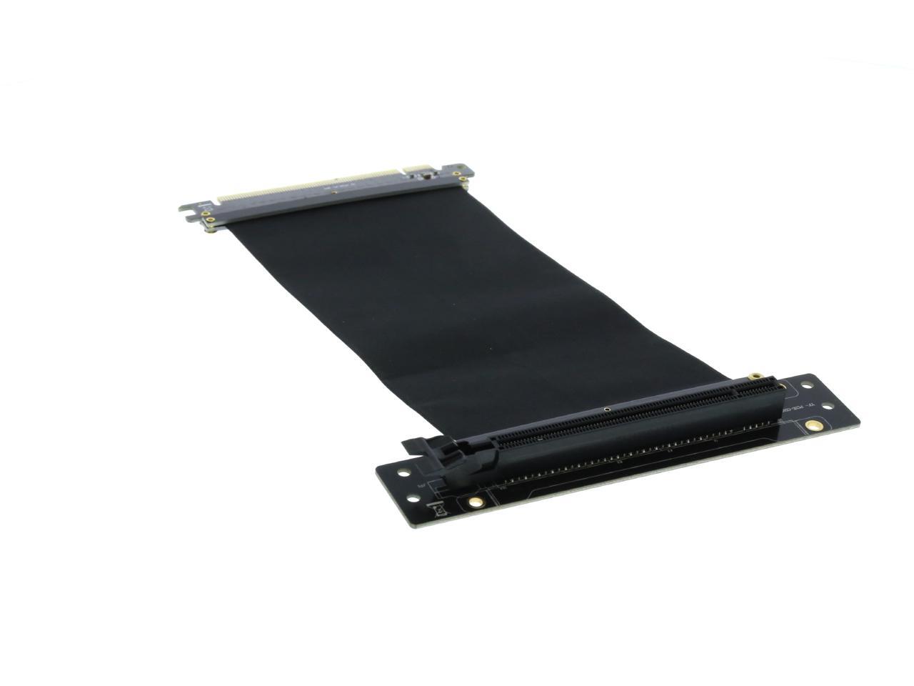 A PCI-E x16 male connector at one end is for connecting to your motherboard, and a PCI-E x16 female 90-degree right angle connector at the other end is for connecting to your graphics card.