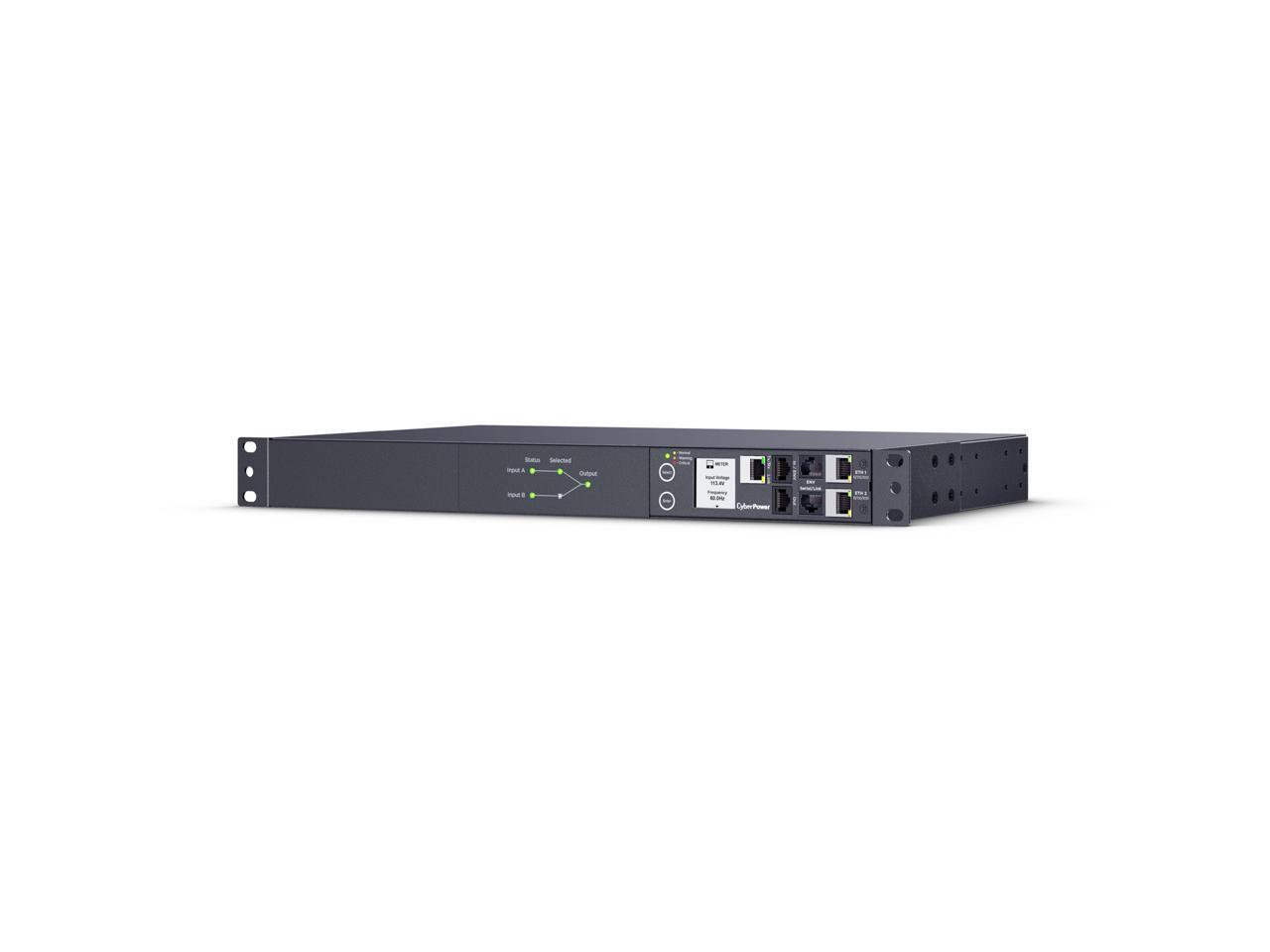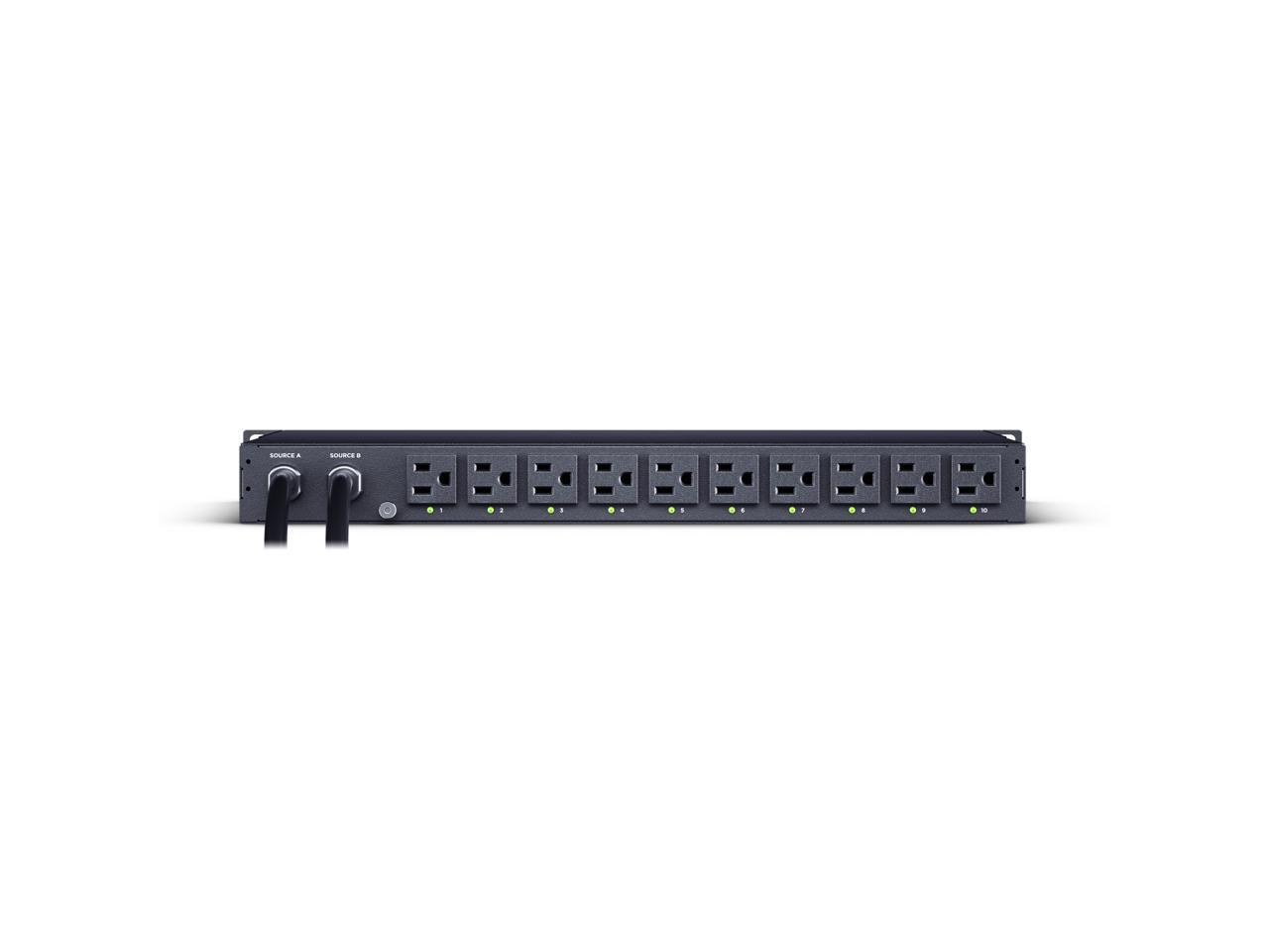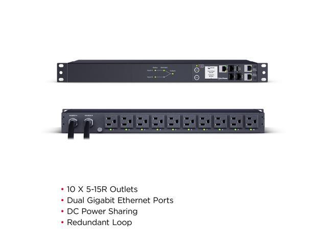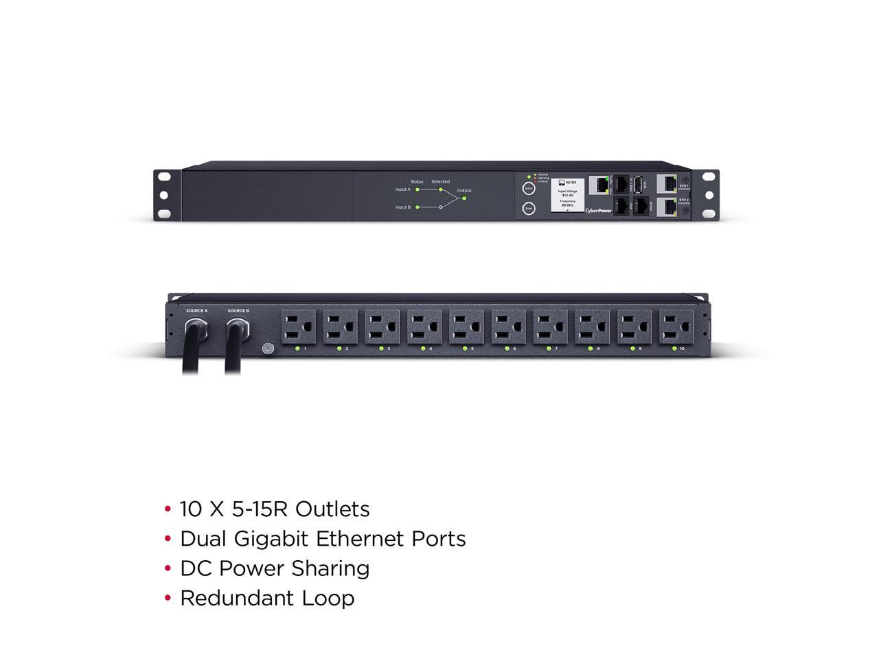 CyberPower PDU44001G Single Phase 100 - 120 VAC 15A Switched ATS, 10 Outlets, 10 ft, 2 x NEMA 5-15P, Horizontal, 1U, SNMP, LCD, 3YR Warranty
