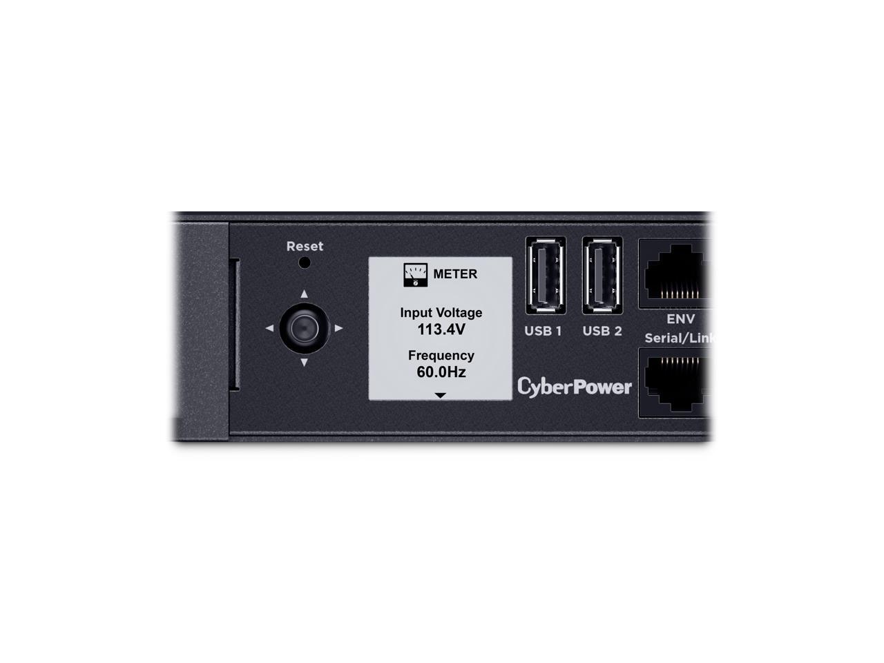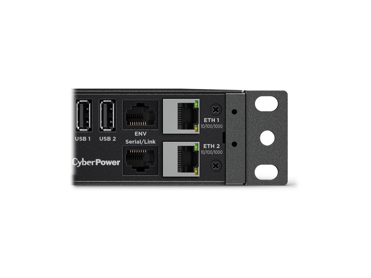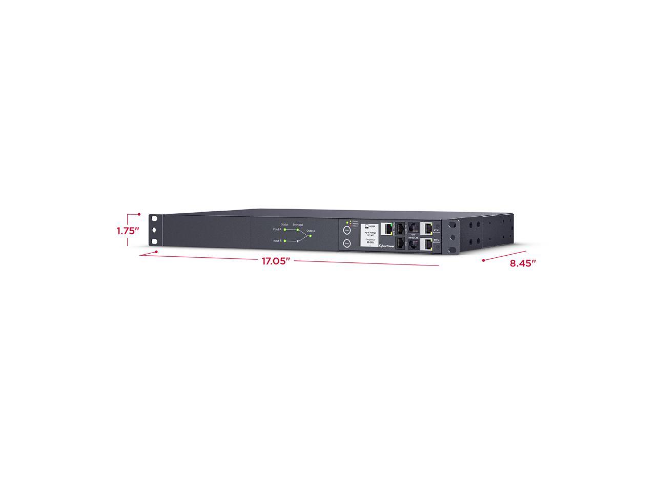 CyberPower PDU44001G Single Phase 100 - 120 VAC 15A Switched ATS, 10 Outlets, 10 ft, 2 x NEMA 5-15P, Horizontal, 1U, SNMP, LCD, 3YR Warranty