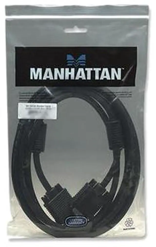 MANHATTAN SVGA Cables easily connect a monitor with a desktop or notebook computer. Ideal for use with video splitters, KVM switches and any HD15-equipped display, computer or device, MANHATTAN SVGA Cables are engineered and constructed of quality materials to deliver dependable transmissions in video applications. Full foil and braided shielding with ferrite cores help minimize EMI interference and mini-coax (RGB) with paired video wire construction combine to provide maximum conductivity and clear, crisp images with reduced distortion over extended distances.