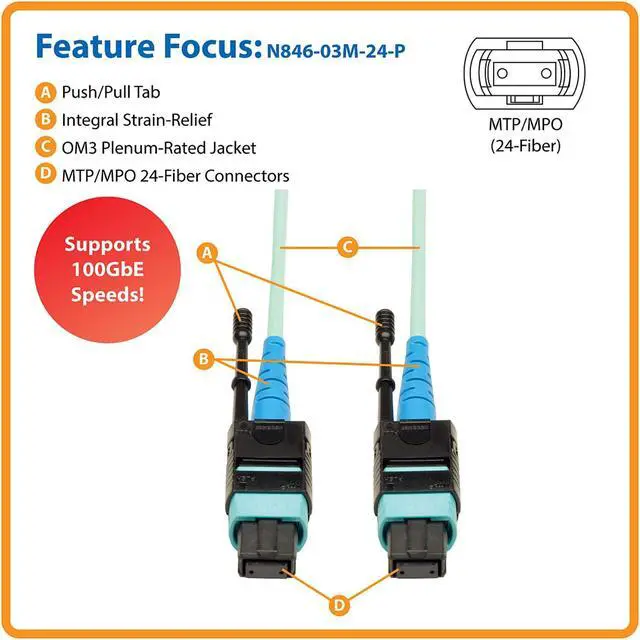 MTP / MPO Push-Pull Connectors for Quick Fiber Optic connections Push/Pull tab connectors offer maximum accessibility in high density installations; install / remove with one hand 24 times the density of SC style connectors No need for long fan-out cables or individual long duplex cable runs High-density design cuts down on installation costs 50/125 OM3 Rated Multimode Fiber, 850nm Plenum rated jacket Unique cable ID label for Quality Control and Traceability Each cable 100% tested for low insertion loss and back reflection Test data supplied with each cable Custom lengths available