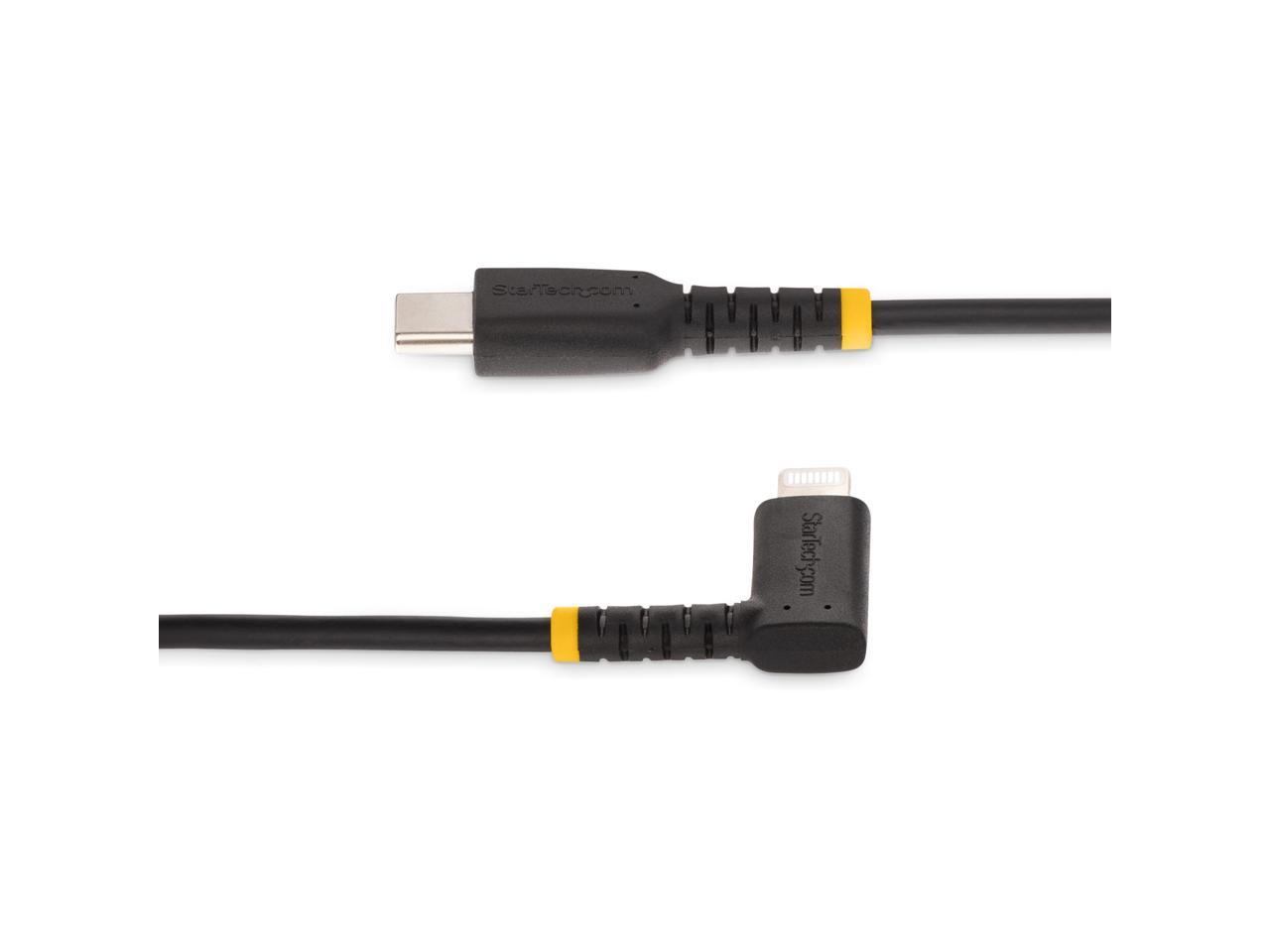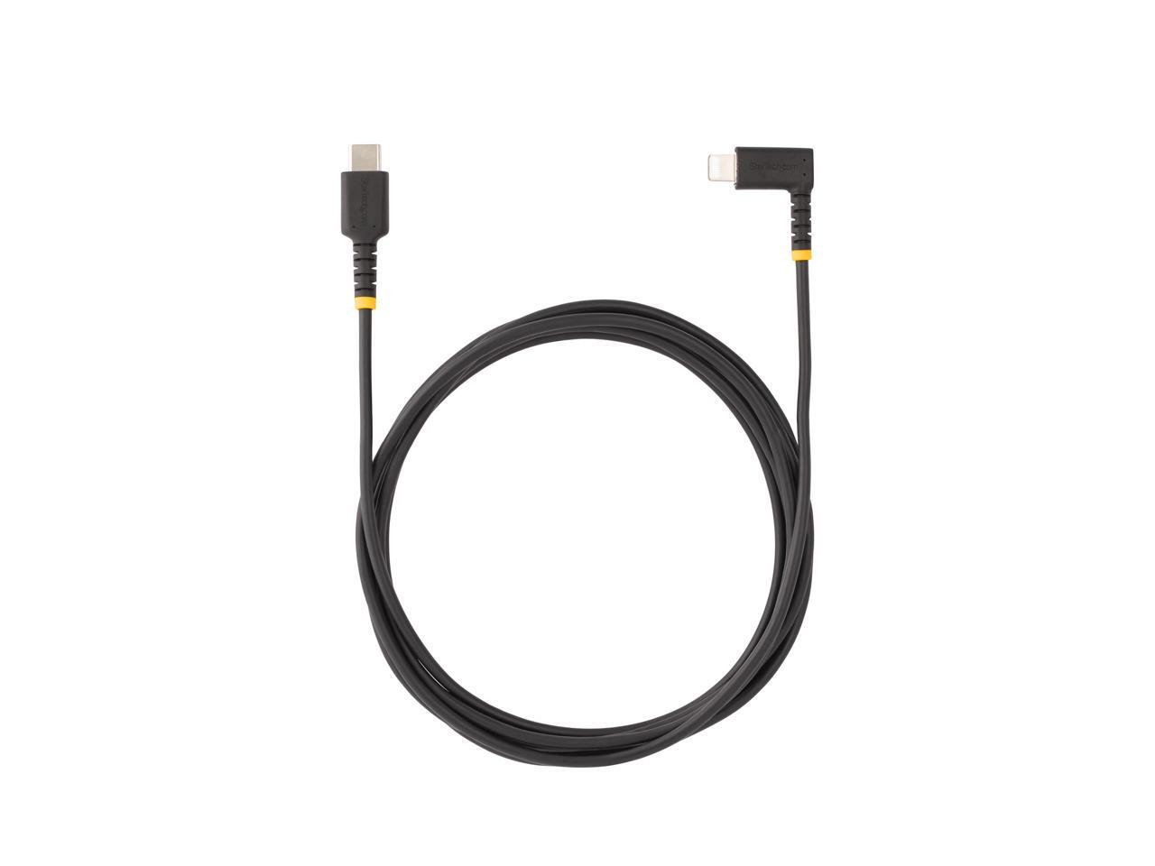 - RIGHT ANGLE LIGHTNING CABLE: 6ft (2m) USB-C to Lightning charging cable features a right angle Lightning connector; Ideal for tight spots allowing the cable to run flush with the device; Reduces strain on the port and connector vs. a straight cable
