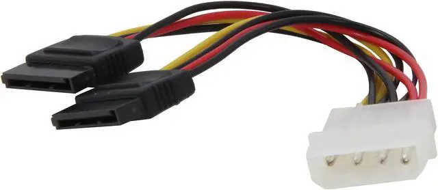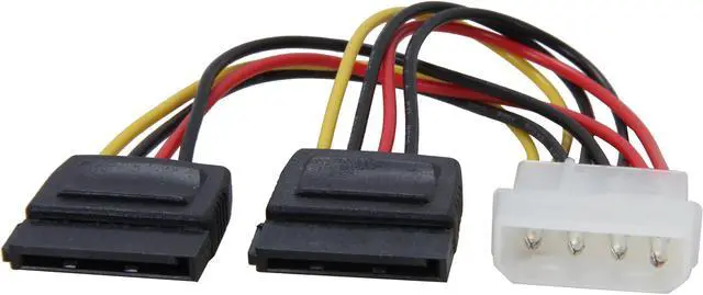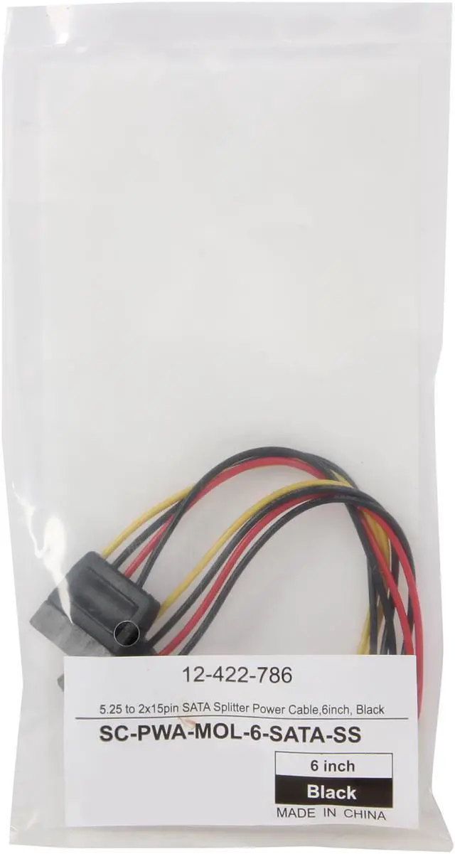 | Specifications | "Length:6 Inches Conductor:20 awg Bare Copper Connector Number:3 One Molex 4-Pin Male to Two SATA 15-Pin Female Y cable(180 degree,Straight-through)" |