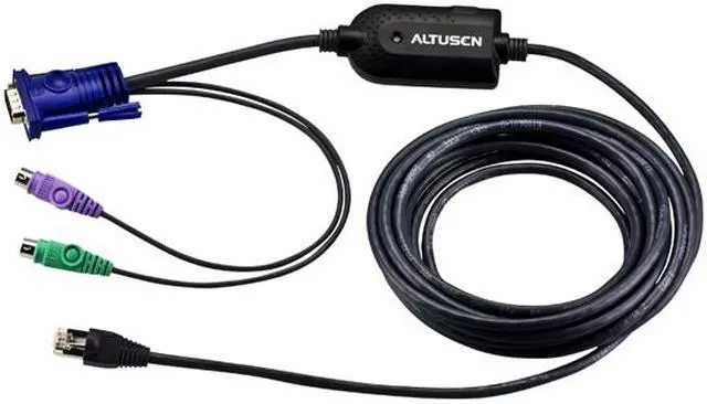 The KA7920 is a Cat5 cable built-in KVM adapter for connection PS/2 interface computers. 14.5 ft Cat5 cable built-in allows users to have connection with KVM and computer without making Cat5 cable themselves or purchase additional Cat5 cable. With its small form factor and light weight, it is easy for cabling management.