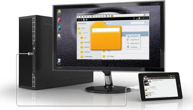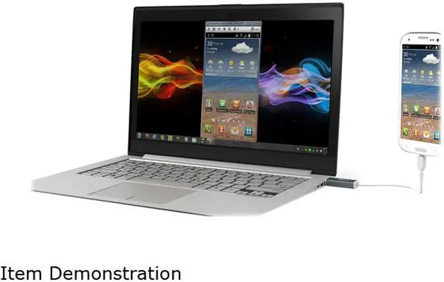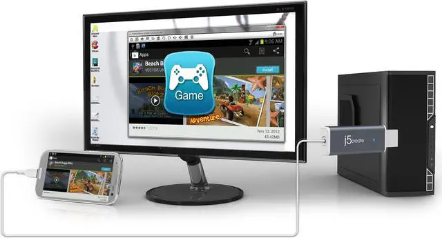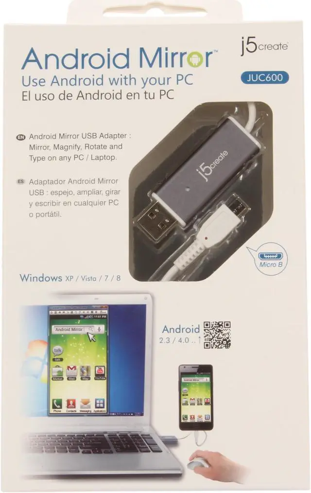 Welcome to the next revolution in Android technology! The Android Mirror from j5create transforms your PC into a full-fledged Android powerhouse. When you connect your Android device through the Android Mirror it allows you to use your device as if it were your computer. Use your full-size keyboard and mouse to send emails, browse the web, check and update your Facebook and Twitter, play your favorite games, and even screen your phone calls – all while charging your phone too!