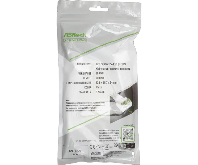 ASRock 12V-2x6 600W PCIe 5.1 GPU Power Cable, Right Angle (L-Type), 2.3ft, 16-Pin 12VHPWR Compatible, NVIDIA RTX 40 Series, White