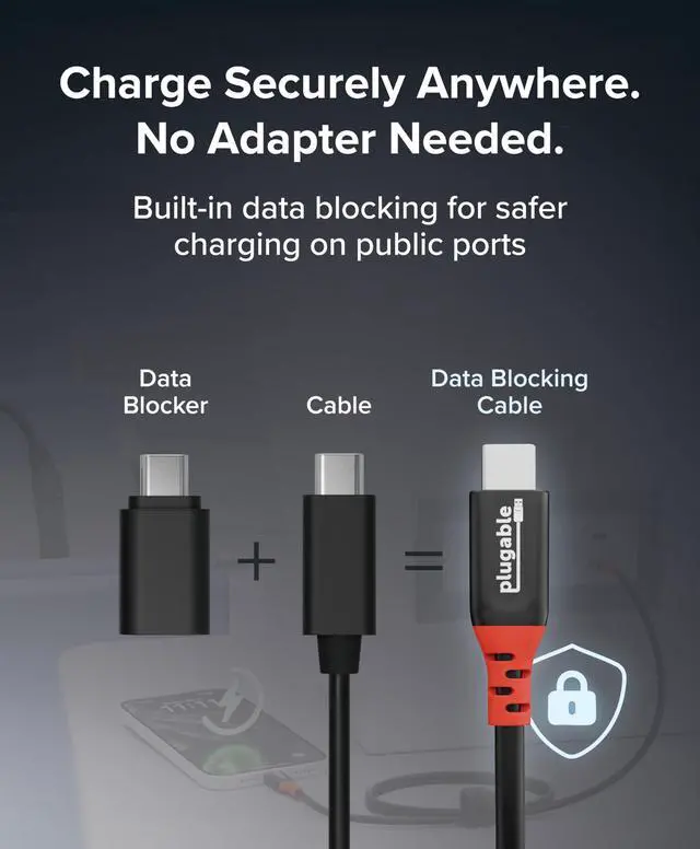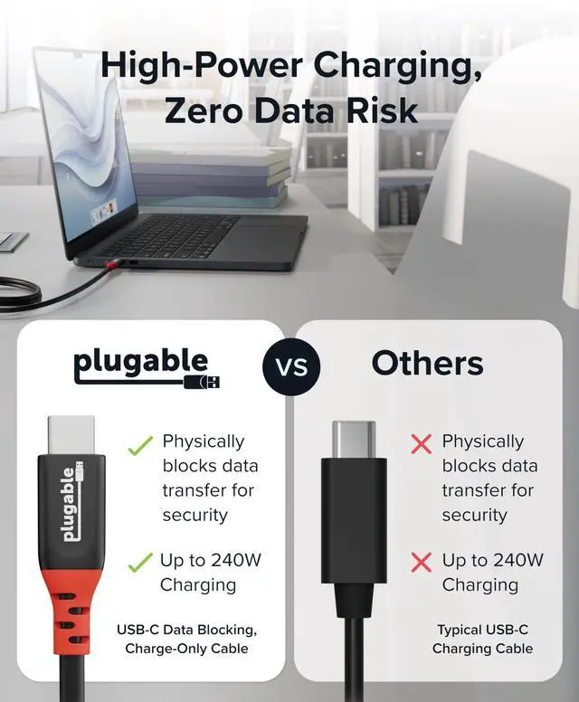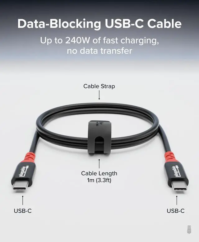 | Features | Get Charged Up - Meet Plugable's 1m (3.3ft) 240W USB-C to USB-C cable designed exclusively for charging. With no data lines for safer use in public spaces and protection against juice jacking. Delivers clean, reliable power to laptops, tablets, and phones. Includes a cable tag so you always know the specs, plus a strap for easy cable management Extended Power Range to 240W - This USB C cable fast charging supports up to 240W power (48V/5A), ideal for gaming laptops, pro workstations, and large tablets. The cable communicates with your device to ensure safe, consistent, and efficient charging Safer by Design - Standard USB-C cables carry data. This true USB C charging cable only physically carries power. That means real protection in airports, cafes, schools, and any public charging port. No adapters needed, just direct, secure charging Universal USB-C Charging - Works with any device that supports USB Power Delivery up to 240W, including MacBook Pro/Air, Dell XPS, Lenovo ThinkPad, iPad Pro, and Samsung Galaxy. This USBC to USBC design fits USB-C chargers, hubs, docks, and other PD-compliant gear Lifetime Support - This USB C fast charging cable has been designed with reliability at its core and was built to meet the deployment demands of IT departments and the ease of use necessary for home offices. Includes lifetime support from our North American team of connectivity experts |