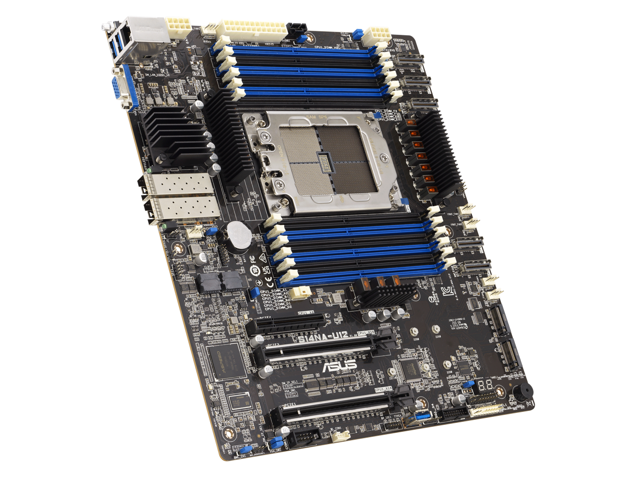 ASUS S14NA-U12 Server motherboard for 64-core AMD EPYC™ 8004-series processors, with dual 25 Gbps LAN, support for two dual-slot GPUs, 12 DIMM DDR5, dual M.2 and integrated ASMB11-iKVM.