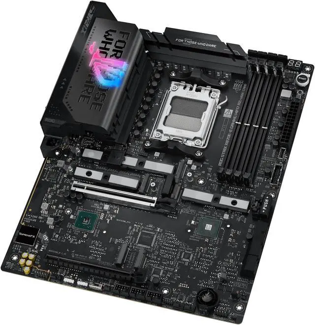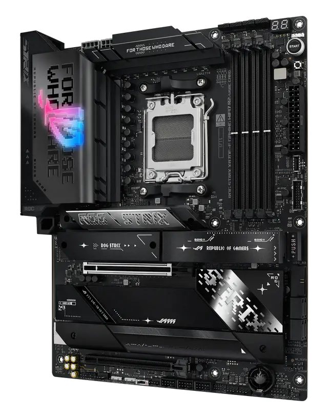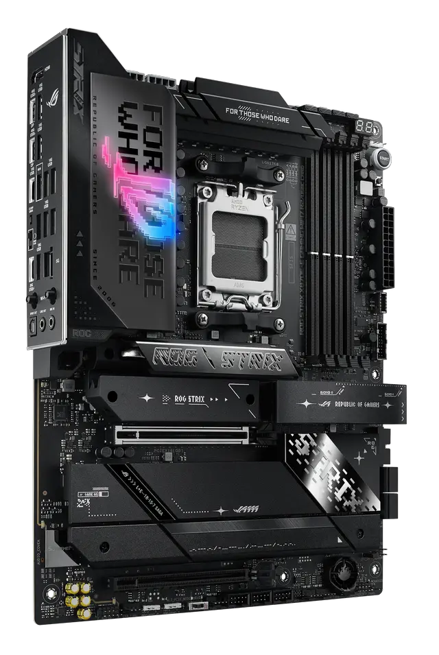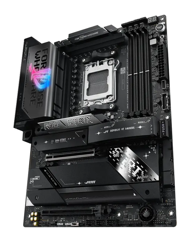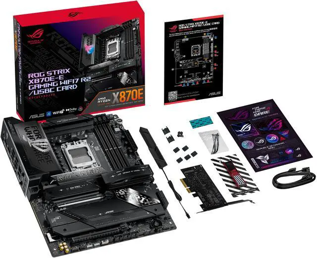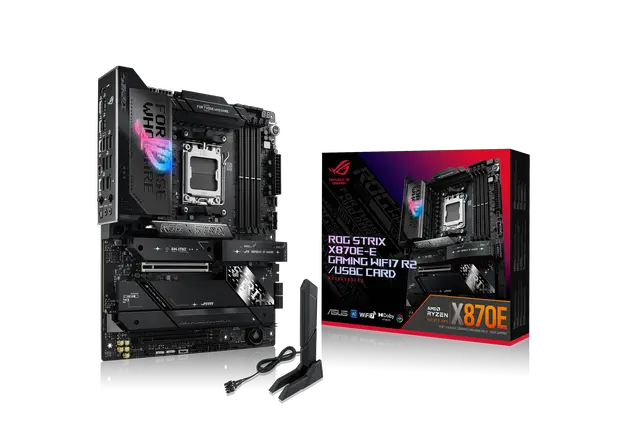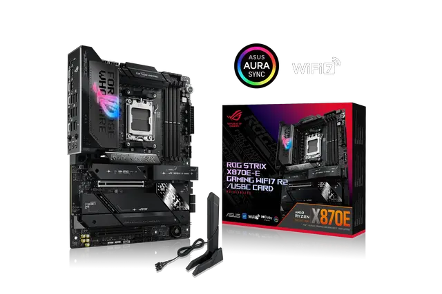 The ROG STRIX X870E-E Gaming WIFI7 R2/USBC card is engineered to harness the full potential of AMD Ryzen™ 9000 Series processors. Featuring PCIe® 5.0 support, AI Overclocking, AI Cooling II, AI Networking II, and AEMP, setup is streamlined while performance is maximized. Dual USB4® Type-C ports and WiFi 7 with Realtek 5Gb Ethernet ensure top-tier connectivity, while robust heatsinks keep M.2 drives cool under heavy loads. This motherboard not only meets the demands of gaming and professional applications but also delivers the power and connectivity essential for advanced AI PC applications.