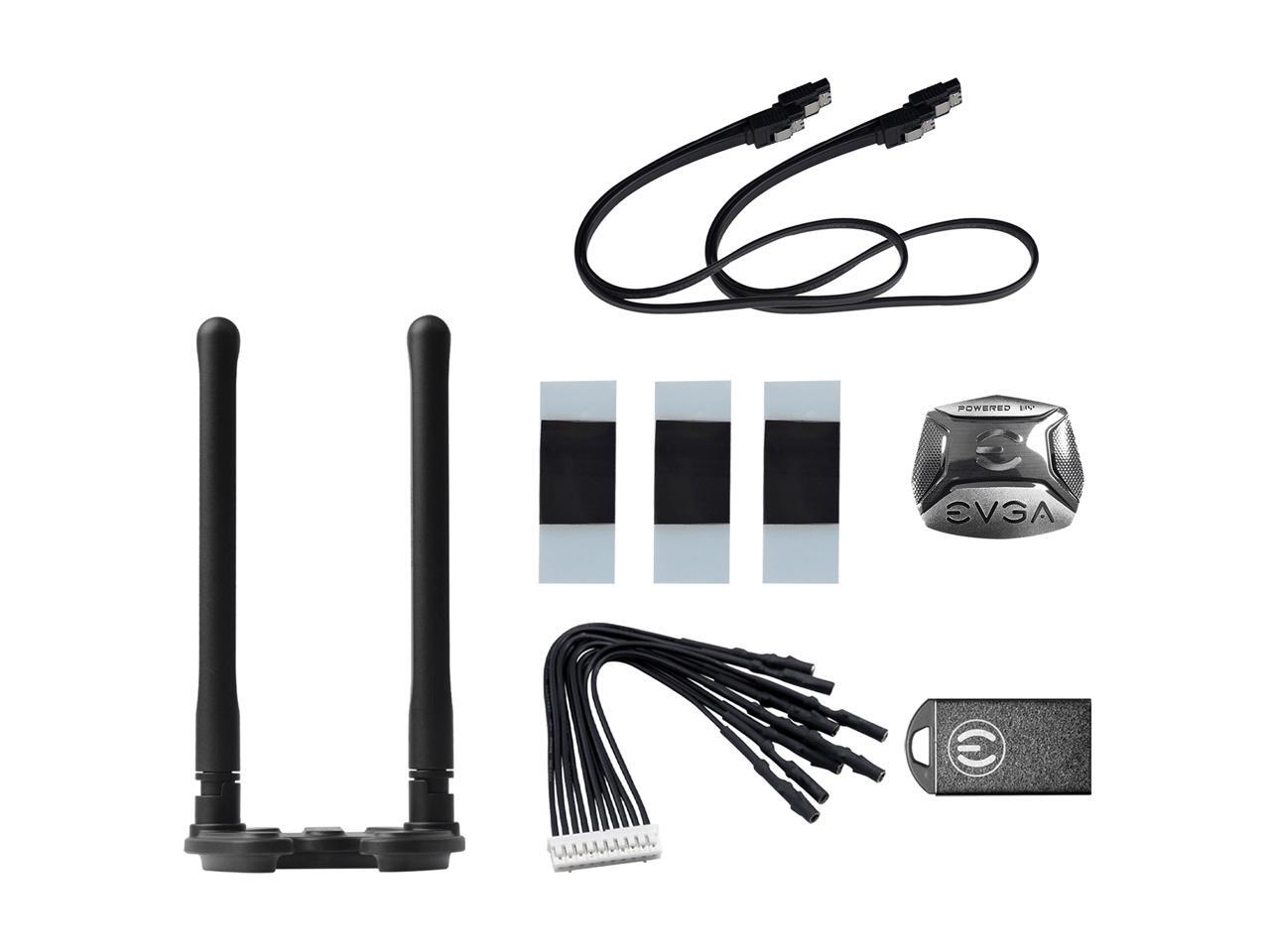 | Package Contents | ACCESSORIES: EVGA Quick Installation Guide 2x SATA 6Gb/s Data Cables M.2 Thermal Pads All-new EVGA Wi-Fi Antenna 2x ProbeIt Cable Baseplate, screws, and standoffs M.2 Screw Kit USB Flash drive with driver and manual |