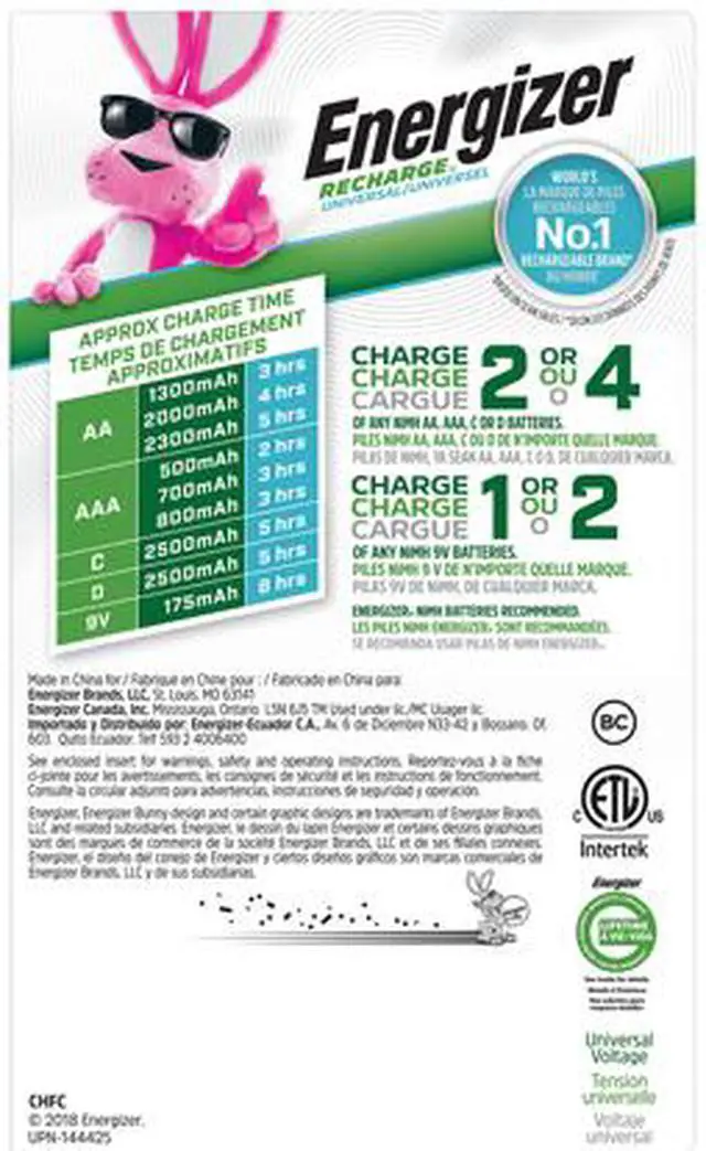 Charging Current: 2 or 4 "AA" 1100mA (1 battery per bay) 1 or 2 "AA-C-D" 1100mA (1 battery per bay) 6 or 8 "AA" 550mA (2 batteries per bay) 3 or 4 "AA-C-D" 550mA (2 batteries per bay) 1 to 4 "AAA" 450mA 2 or 4 "AAA" 450 mA 6 or 8 "AAA" 450 mA 1 to 2 "9V" 30mA