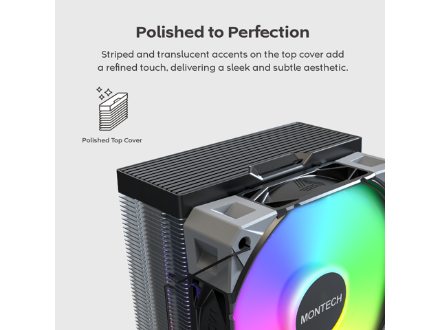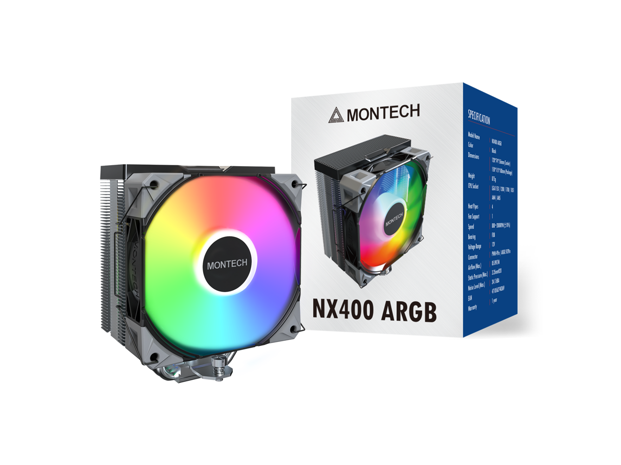 MONTECH NX400 ARGB - CPU Air Cooler, Single Tower, 4 Advanced Heat Pipes, 52-fin Heat Sink, E28, 120mm FDB Static Pressure Fan, 28mm Fan Thickness, Polished Top Cover, ARGB Lightning - Black