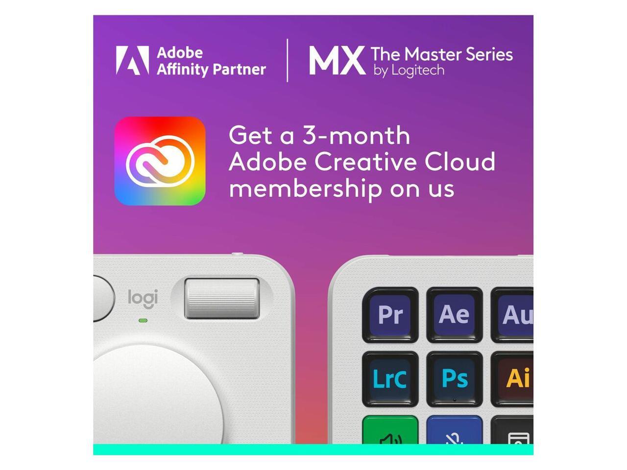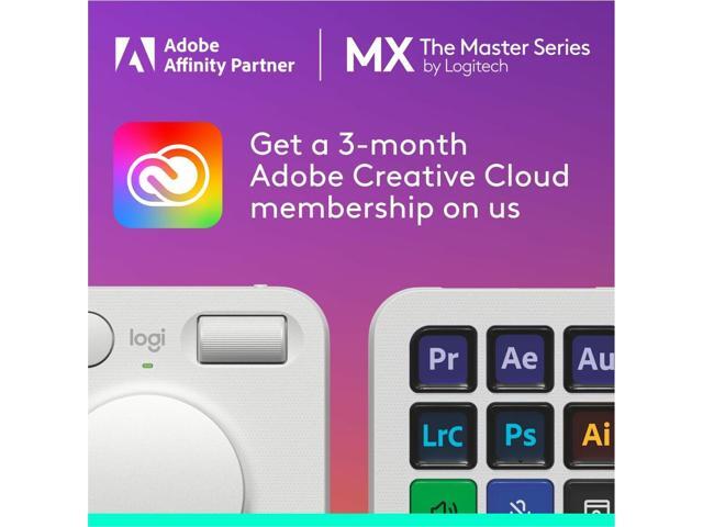 - 3-months of Adobe Creative Cloud on us: Pair two of the world’s top creative tools. Buy one MX Creative Console and claim your free 3-month Adobe Creative Cloud membership