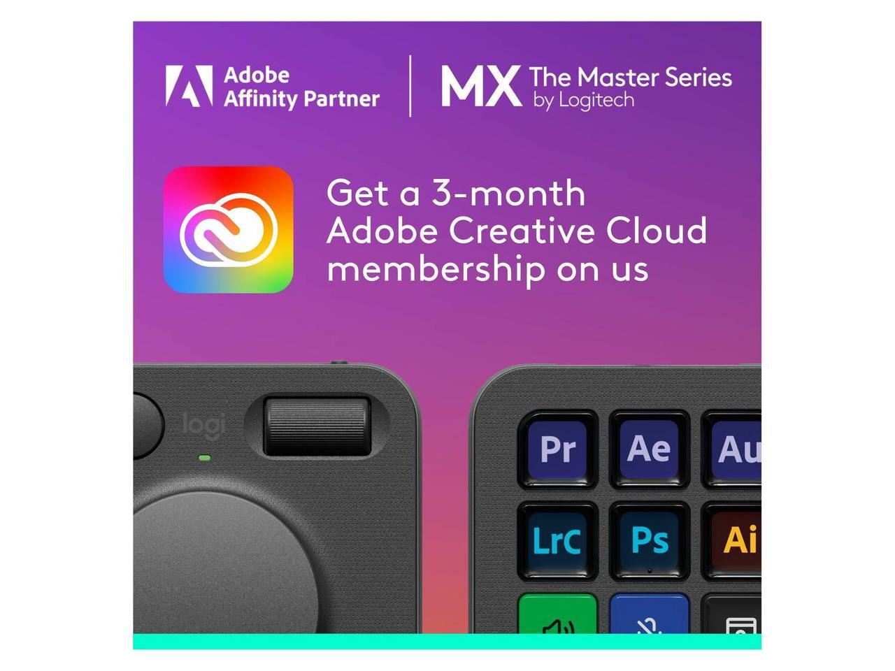 - 3-months of Adobe Creative Cloud on us: Pair two of the world’s top creative tools. Buy one MX Creative Console and claim your free 3-month Adobe Creative Cloud membership