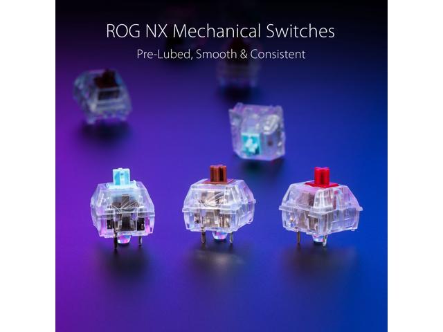 - ROG NX mechanical switches: Lubricated stem and housing for smoother clicks and to eliminate bouncing noise respectively, fast actuation and ROG-tuned force curves for great, consistent keystrokes
