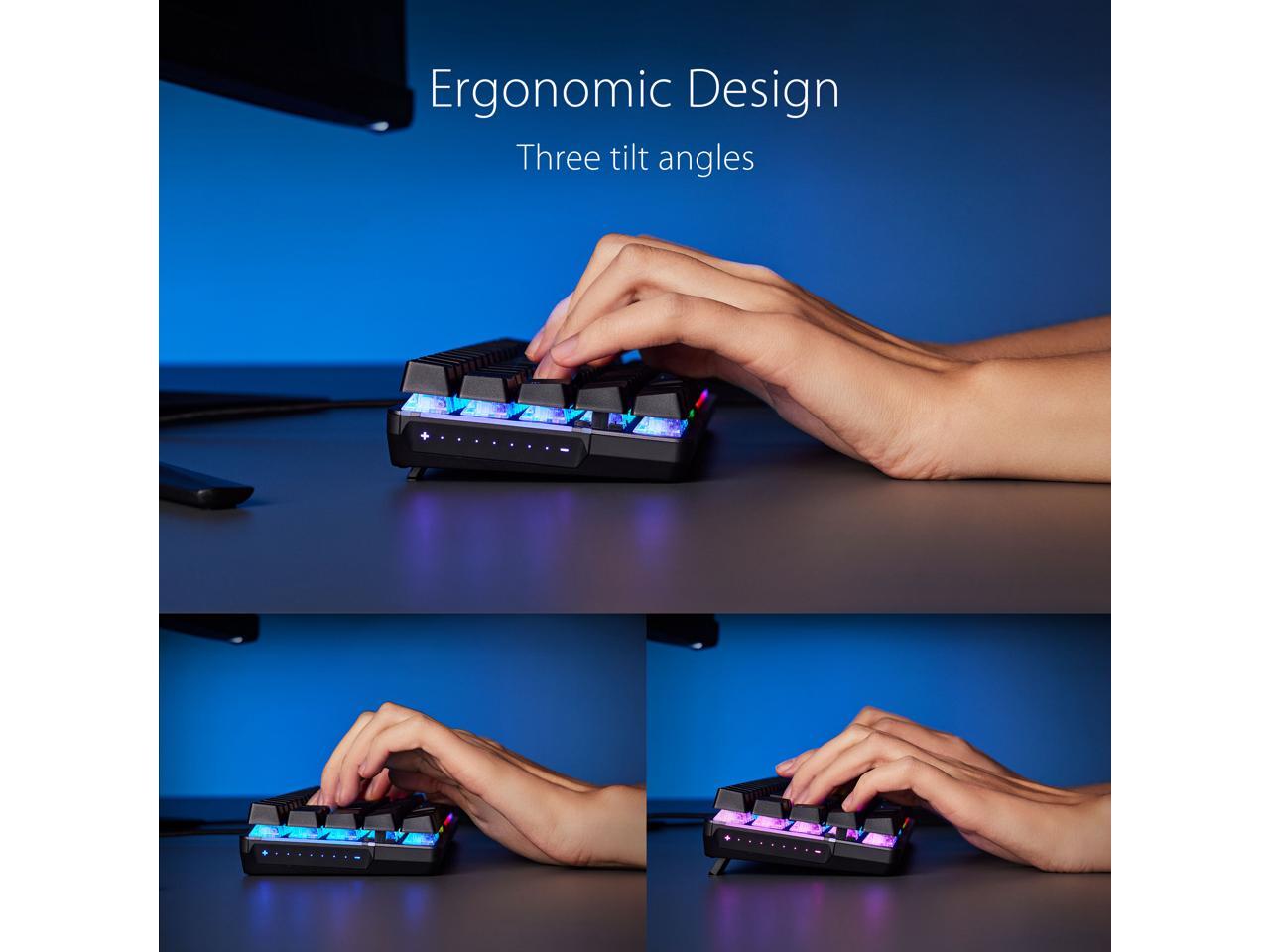 - Ergonomic design: Three keyboard tilt angles for comfort and control