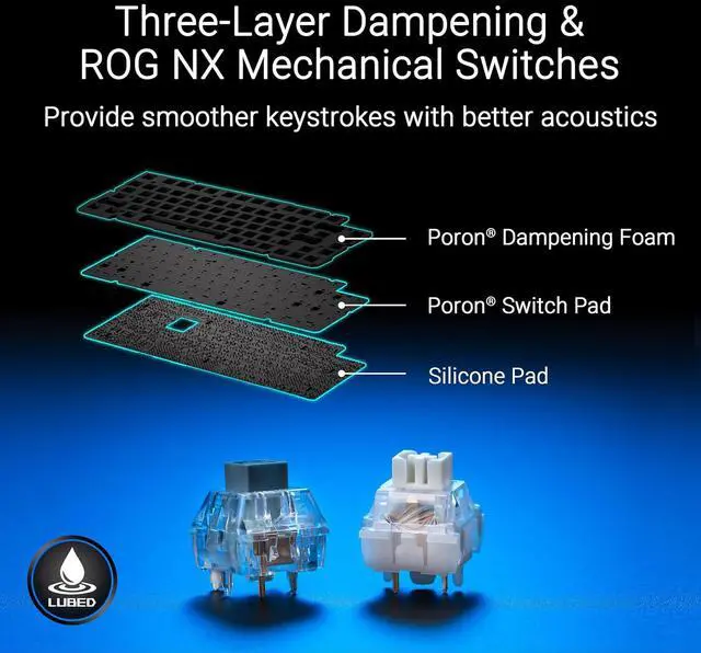 Carbon-Fiber Plate & Three-Layer Dampening: Carbon-fiber positioning plate offers crisp yet controlled keystrokes. Dual PORON foams and a silicone pad absorb vibrations for a refined sound profile and smooth feel