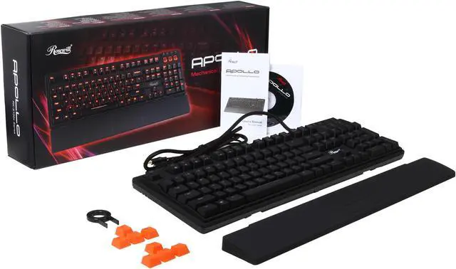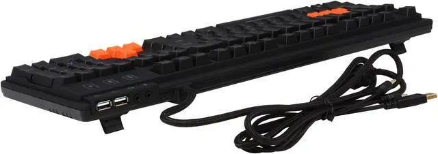 | Features | 100% Cherry MX Red Mechanical Key Switches Custom Programmable Keyboard 5 Profiles with Quick Switch Keys Up to 50 Macro Keys Individually Red LED Backlit Keys 3 Levels of Brightness Control + 1 Breathing Mode N-Key Rollover Built in Headphone & Microphone Pass-Through Jacks 2 Built in High-Speed USB 2.0 Hub Detachable Wrist Rest for Maximum Support and Comfort Gold-Plated Connectors to Reduce Latency Includes 8 Orange Gaming Keys with Key Puller Multimedia Keys with Gaming Mode High Quality Braided Fiber Cable Soft Rubberized Surface |