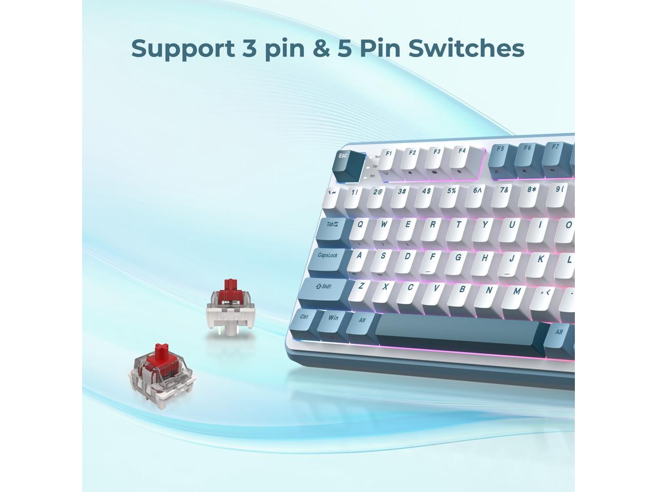 Features hot-swappable sockets for 3/5-pin switches and double-shot PBT keycaps for lasting feel and fade-resistant labeling.