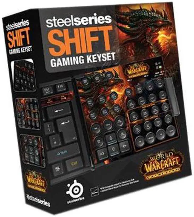 | Features | The SteelSeries Shift World of Warcraft: Cataclysm Edition Bundle presents gamers with predefined game mods and an intuitive layout of the most common commands, actions and emotes. The Keyset helps groups run more smoothly through its ability to mark targets for added group and raid functionality. The SteelSeries Shift Keyset provides new functionality that reflect changes that have come over the game since the last expansion. Its labeled and color coded keys, together with the World of Warcraft: Cataclysm artwork and functionality, will immerse players into the world of Azeroth and help to accelerate game mastery. Powered by SteelSeries Engine software, the SteelSeries Shift World of Warcraft: Cataclysm Edition Bundle provides gamers with predefined game mods and an intuitive layout of the most common commands and actions for specific game genres and titles. With the functionality to customize every key on the keyset, on-the-fly macro recording, and the anti-ghosting of up to 7 simultaneous keystrokes, the SteelSeries Shift World of Warcraft: Cataclysm Edition Bundle is designed to help in the mastery of any game. 8 programmable hotkeys On-the-fly macro recording Multiple media controls Gold plated audio & headset jacks 2 USB 2.0 ports (1 powered) Ergonomic design with 3 leg levels and non-slip base Detachable wrist rest Keyset features include: One-touch macros for raiding and PvP gameplay The ability to mark targets for added group and raid functionality Extended raid functionality to better manage raid groups as well as easily find a raid group to join All commands are labeled and color coded on all keys Compatible with all versions of World of Warcraft |