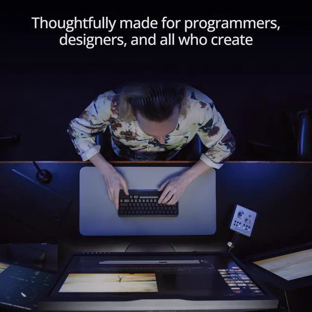 Our new, linear key switches offer a soft, muted tone with light actuation to reduce key chatter and hand fatigue—allowing deep concentration even after hours of typing. This keyboard is also hot-swappable, so you can easily integrate your preferred switches and create your perfect tool and environment for creation.
