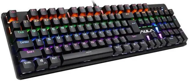 | Features | Elegant and minimalist style. Brushed aluminum chassis provides rugged durability. Aula Armor Technology suitable for all circumstance. Highly durable Double-shot injection molding keycaps. Multicolor backlighting for virtually unlimited game customization. 50 million times ultra-long lifetime mechanical switch. Keyboard goes into sleep mode to turn off all LED after 10 minutes of idle. Press any key to wake up. User-friendly design with a set of shortcut function keys cooperated with Fn Key. 100% Anti-Ghosting with 104 Key Roll-over on USB. Water resistant, dust proof and static-free. |