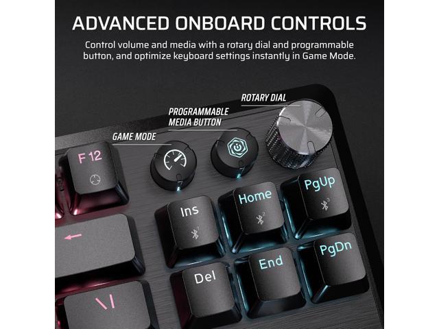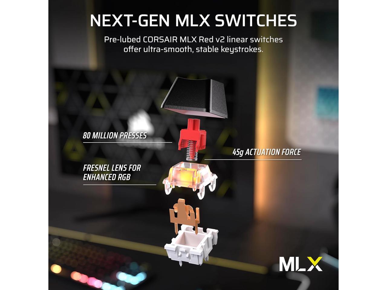 Pre-Lubed MLX Red v2 Switches: Pre-lubricated CORSAIR MLX Red v2 linear mechanical switches deliver smooth, responsive, and stable keystrokes, with enhanced ultra-bright per-key RGB backlighting.