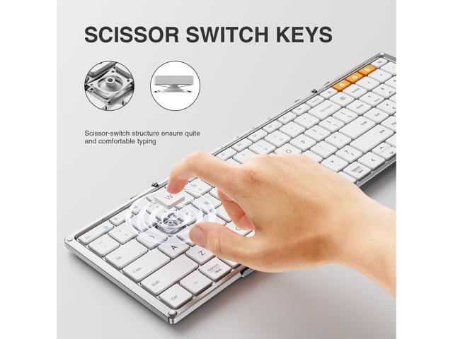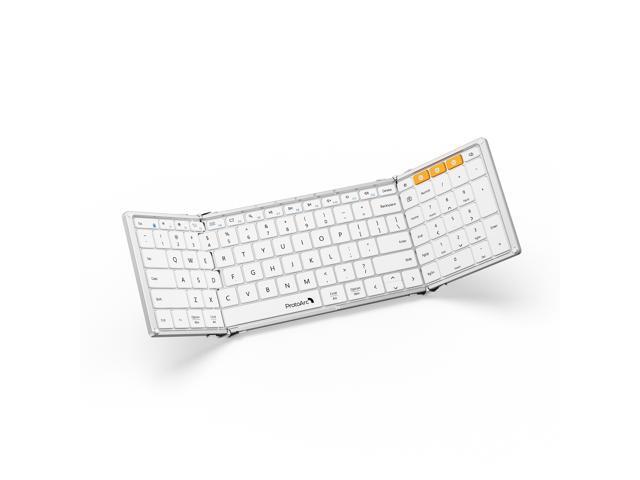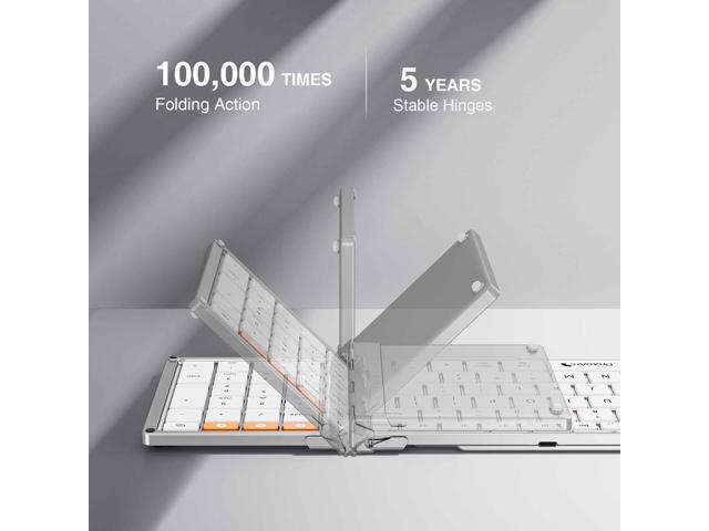 - Tri-Fold Bluetooth Keyboard: Full-size 105-key layout with 16.5mm keycaps delivers desktop typing in a portable design. Ultra-slim flat typing surface (no tilt) enables effortless portability, while the simple fold-and-go mechanism (no locking clips) ensures quick deployment.