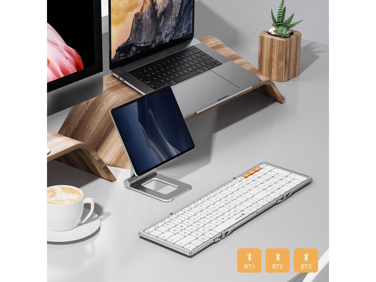 - Connectivity Across 3 Devices: Sync up to 3 devices simultaneously via Bluetooth channels with our compact keyboard. Effortlessly switch between devices at the press of a button. Compatible with Windows, Mac OS, iOS, or Android devices, enhancing your workflow across your iPad, phone, tablet, or laptop seamlessly.