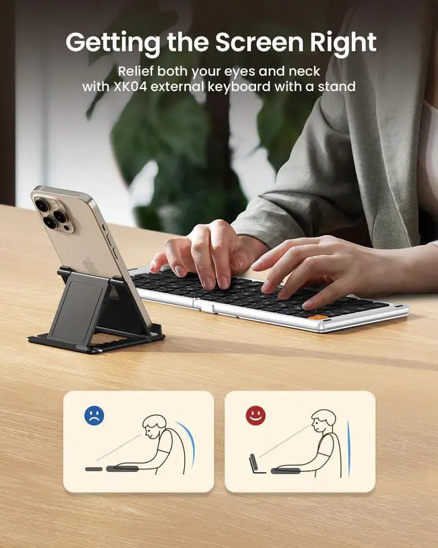| Package Contents | 1*XK04 Foldable Compact Keyboard 1*USB-C cable for recharging 1*Collapsible Phone Holder 1*User Guide |