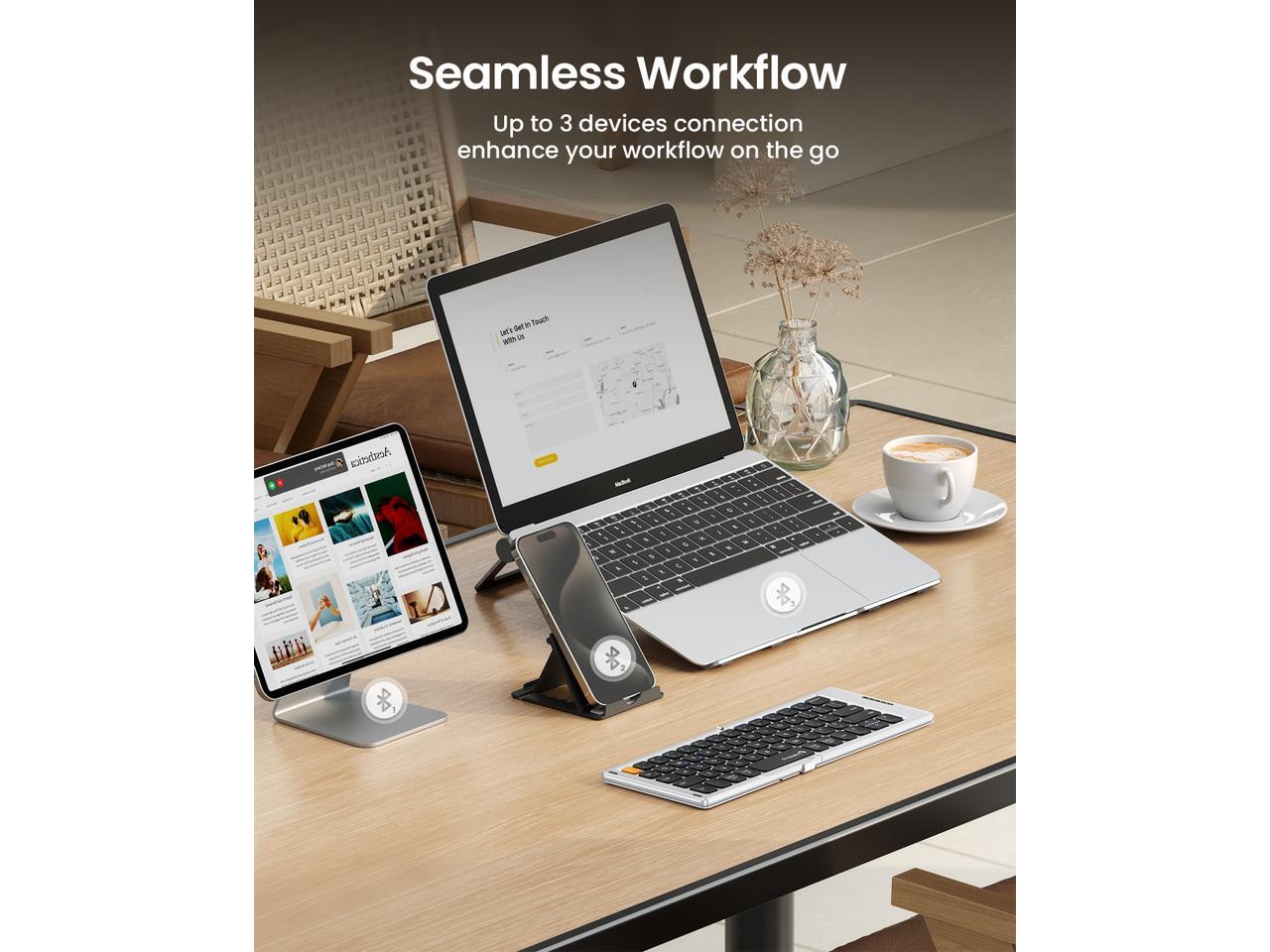 - Multi-device Bluetooth Keyboard: Our foldable keyboard with triple Bluetooth channels, which will maintains stable connectivity and fast response within 33ft operating range(Note: Turn on the Power button before connecting). Supports up to 3 devices such as ipad, smartphone, tablet or laptop. It can be your perfect partner to help you reply to emails, edit excel sheets or write down your ideas anytime.