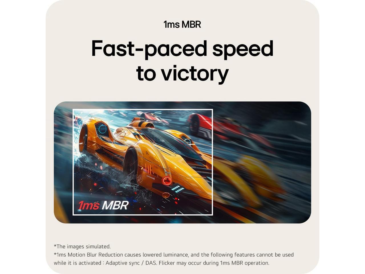 - 1ms Motion Blur Reduction for Crisp Gameplay - 1ms Motion Blur Reduction(MBR) keeps fast-paced gameplay sharp by minimizing blur and ghosting.